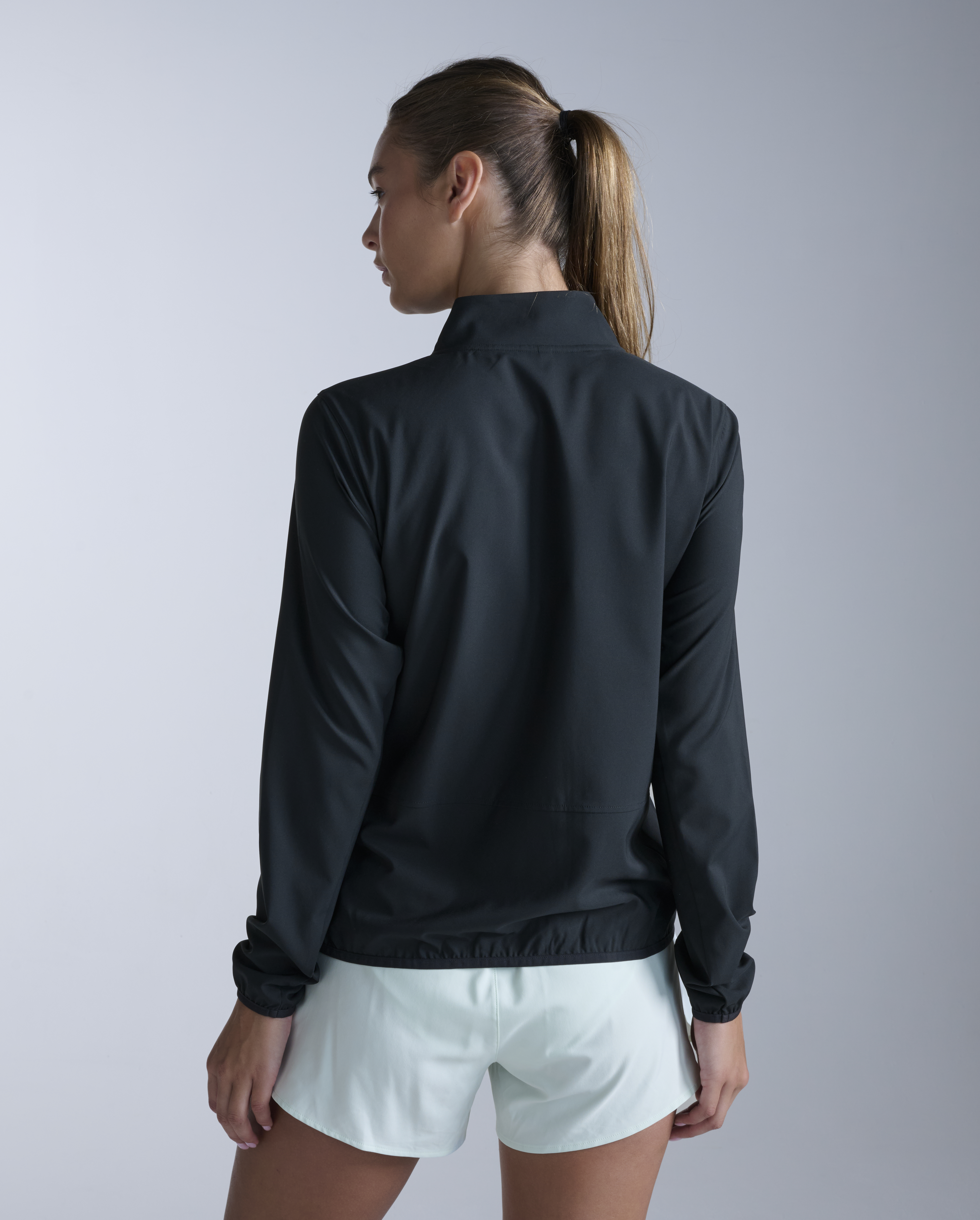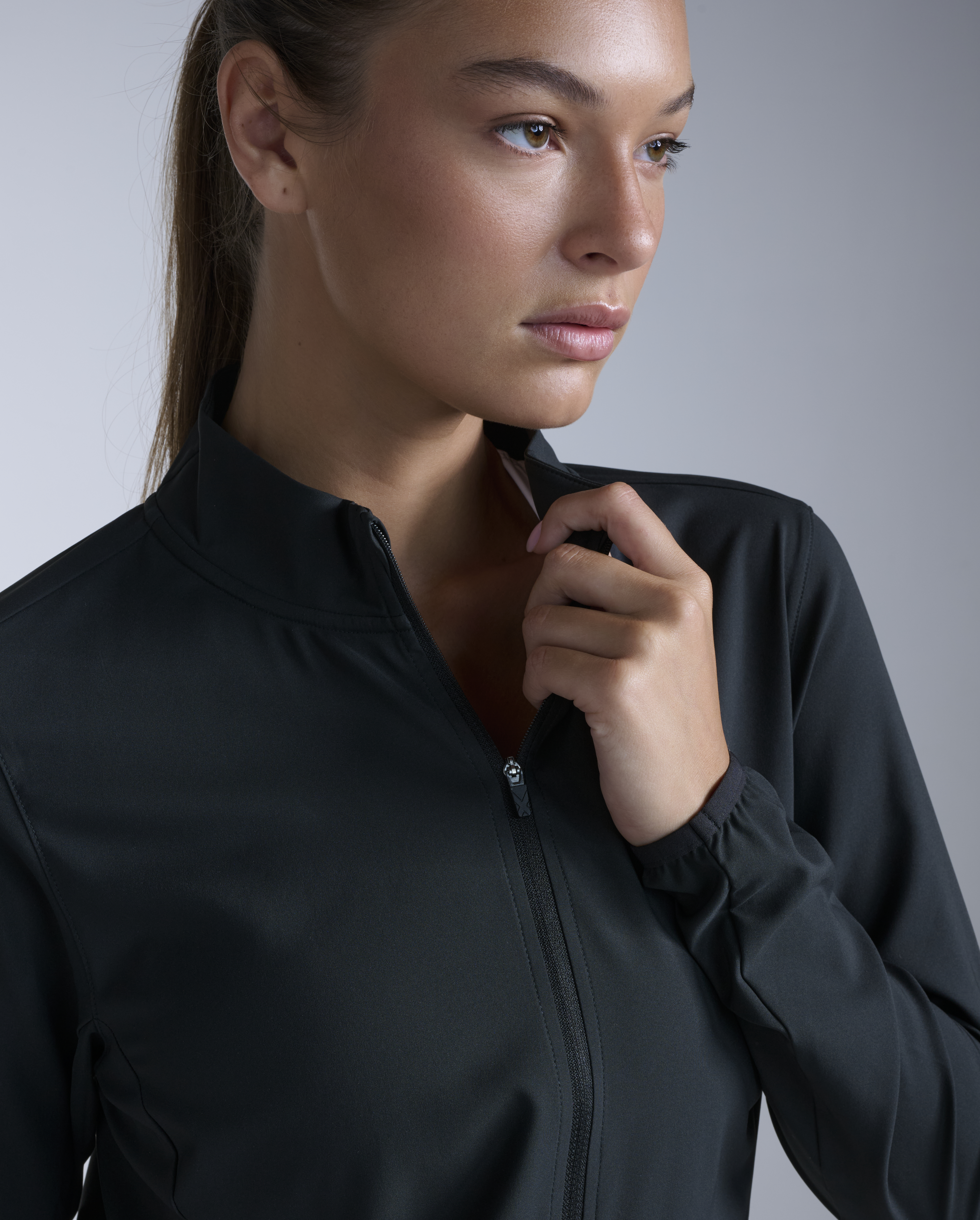 Lett mekanisk stretch woven jakke med høy krage er behandlet med miljøvennlig C0 DWR behandling for å tåle nedbør.