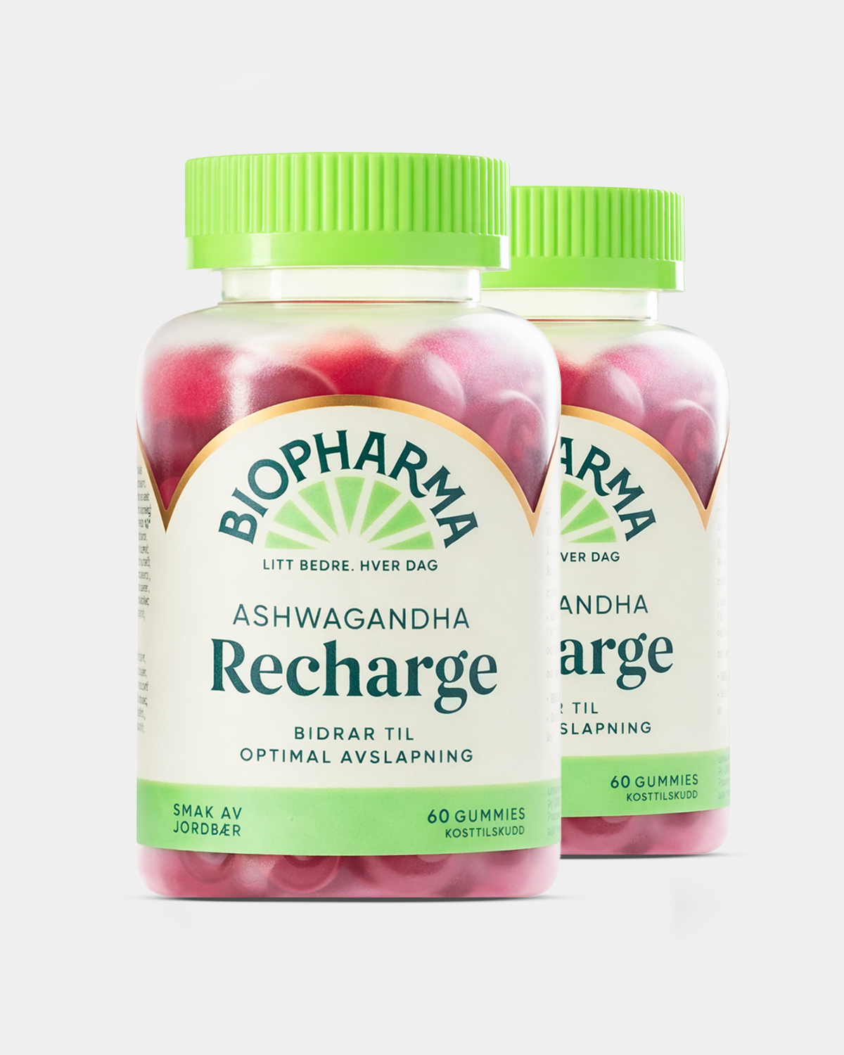 Biopharma Ashwagandha Recharge Gummies inneholder ashwagandha rotekstrakt og vitamin D. Ashwagandha bidrar til optimal avslapning og mental kapasitet i perioder med svakhet, utmattelse, tretthet og tap av konsentrasjon. Vitamin D bidrar til å opprettholde normal muskelfunksjon.