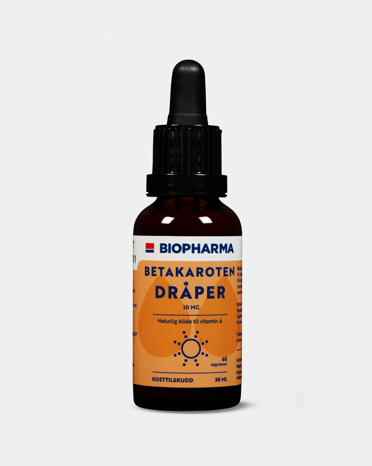 Biopharma Betakaroten Dråper er en naturlig og vegansk kilde til betakaroten utvunnet fra algen Dunaliella salina. Betakaroten omdannes i kroppen til vitamin A, som bidrar til å opprettholde normal hud, normalt syn og immunsystemets normale funksjon.
