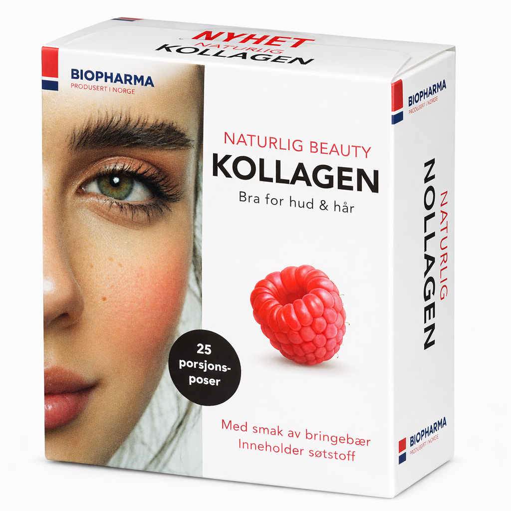 Biopharma Kollagen med bringebærsmak er et kosttilskudd som inneholder hydrolysert marint kollagen fra norsk fisk, tilsatt vitamin C og biotin. Vitamin C bidrar til normal kollagendannelse, som har betydning for hudens normale funksjon. Biotin bidrar til å opprettholde normalt hår og normal hud.