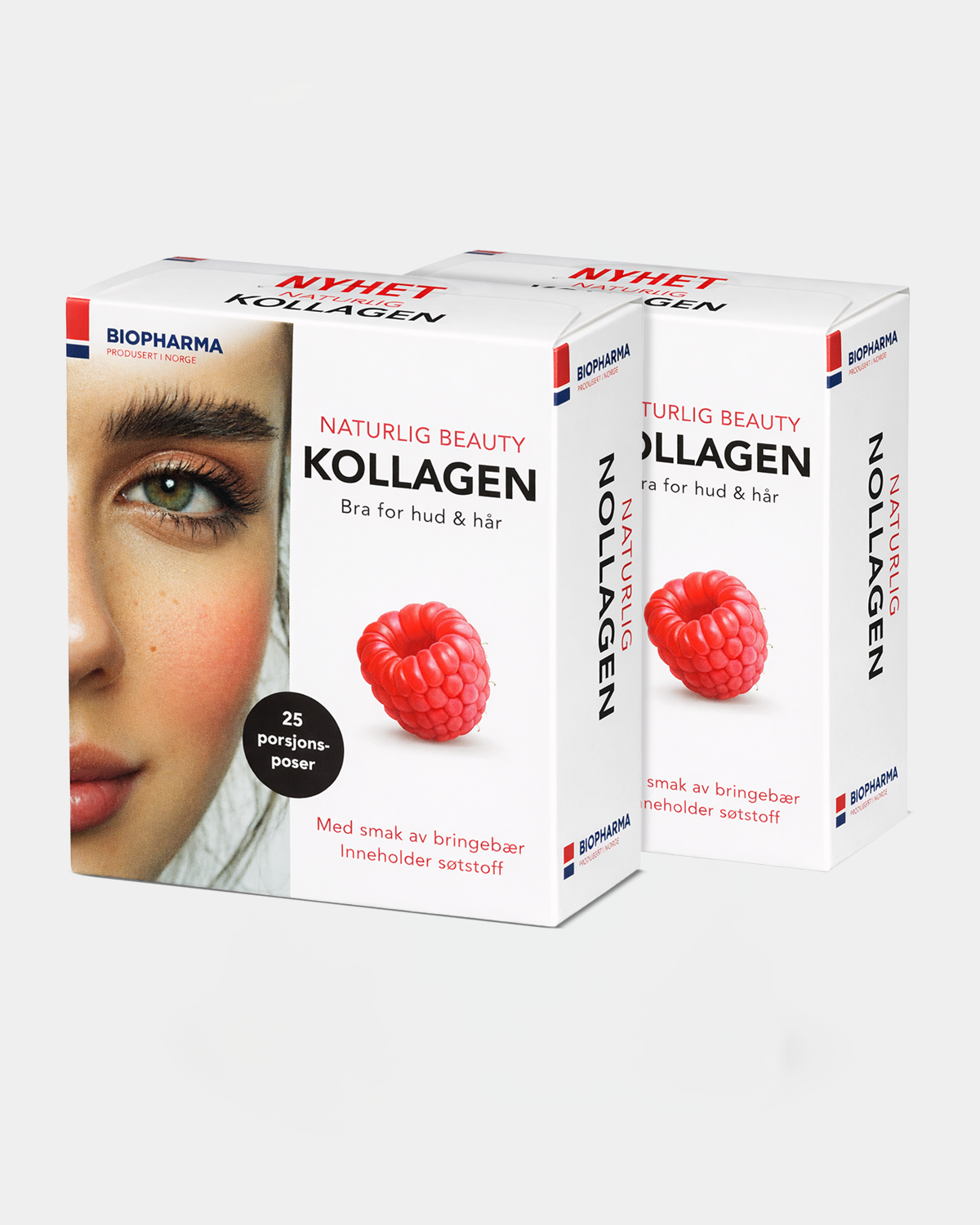 Biopharma Kollagen med bringebærsmak er et kosttilskudd som inneholder hydrolysert marint kollagen fra norsk fisk, tilsatt vitamin C og biotin. Vitamin C bidrar til normal kollagendannelse, som har betydning for hudens normale funksjon. Biotin bidrar til å opprettholde normalt hår og normal hud.