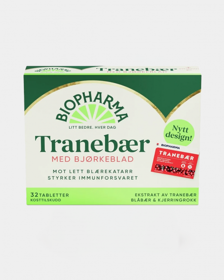 Biopharma Tranebær er et kosttilskudd med nøye utvalgte planteekstrakter fra tranebær, blåbær, bjørkeblad og kjerringrokk – kombinert med vitamin C.