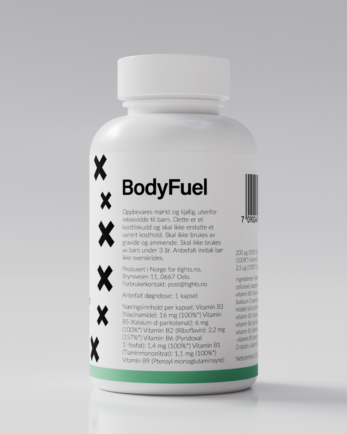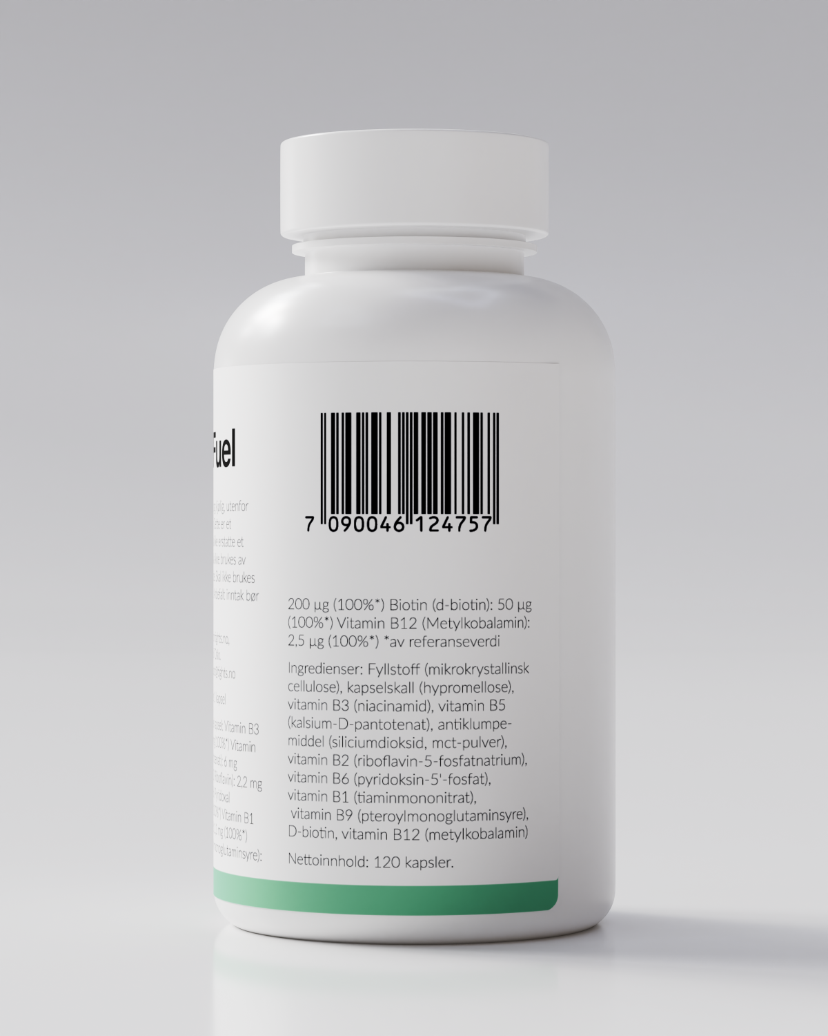 Ingredienser: Fyllstoff (mikrokrystallinsk cellulose), kapselskall (hypromellose), vitamin B3 (niacinamid), vitamin B5 (kalsium-D-pantotenat), antiklumpemiddel (siliciumdioksid, mct-pulver), vitamin B2 (riboflavin-5-fosfatnatrium), vitamin B6 (pyridoksin-5'-fosfat), vitamin B1 (tiaminmononitrat), vitamin B9 (pteroylmonoglutaminsyre), D-biotin, vitamin B12 (metylkobalamin)