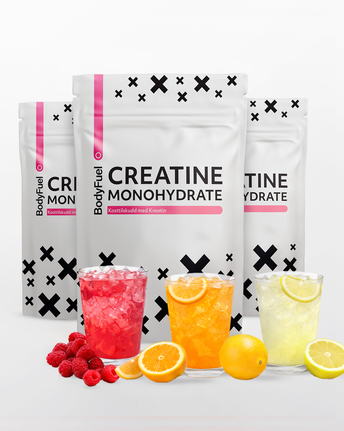 Bodyfuel kreatin med smak i 3-Pack gir deg effektiv kreatinmonohydrat i tre forskjellige populære smaker – Orange, Raspberry og Lemonade – slik at du kan variere smaken uten å gå på kompromiss med effekt og kvalitet.