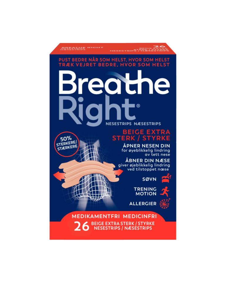 Breathe Right Nesestrips Beige Extra Strength er fleksible, fjærlignende bånd som forsiktig løfter og åpner nesen for bedre luftstrøm, slik at du kan puste lettere. Breathe Right® lindrer umiddelbart nesetetthet som kan oppstå ved forkjølelse, allergier eller skjev neseseptum.