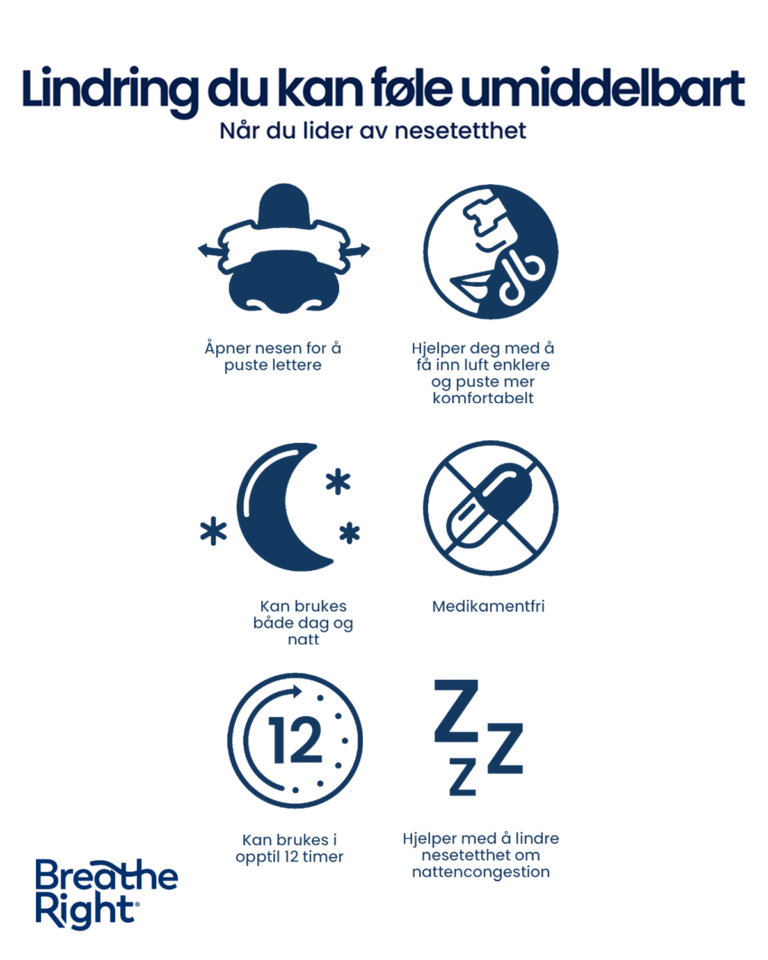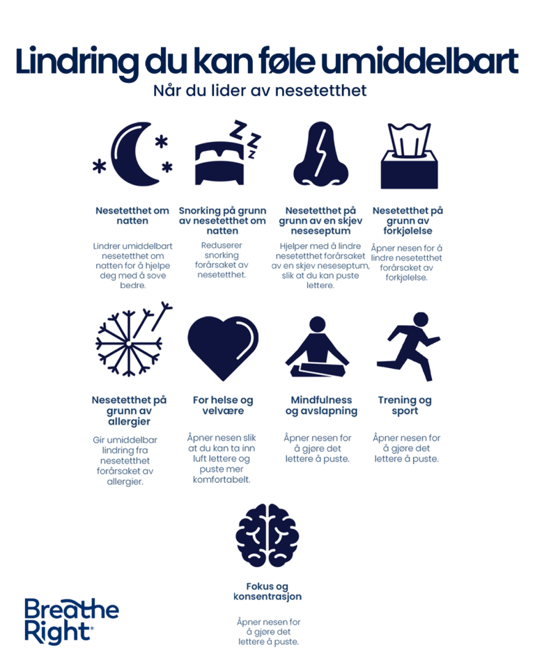 Breathe Right Nesestrips Beige Extra Strength åpner nesen slik at du lettere kan trekke pusten ved nesetetthet. Dette bidrar til å gjøre pusten mer komfortabel og gjør produktet egnet til bruk: