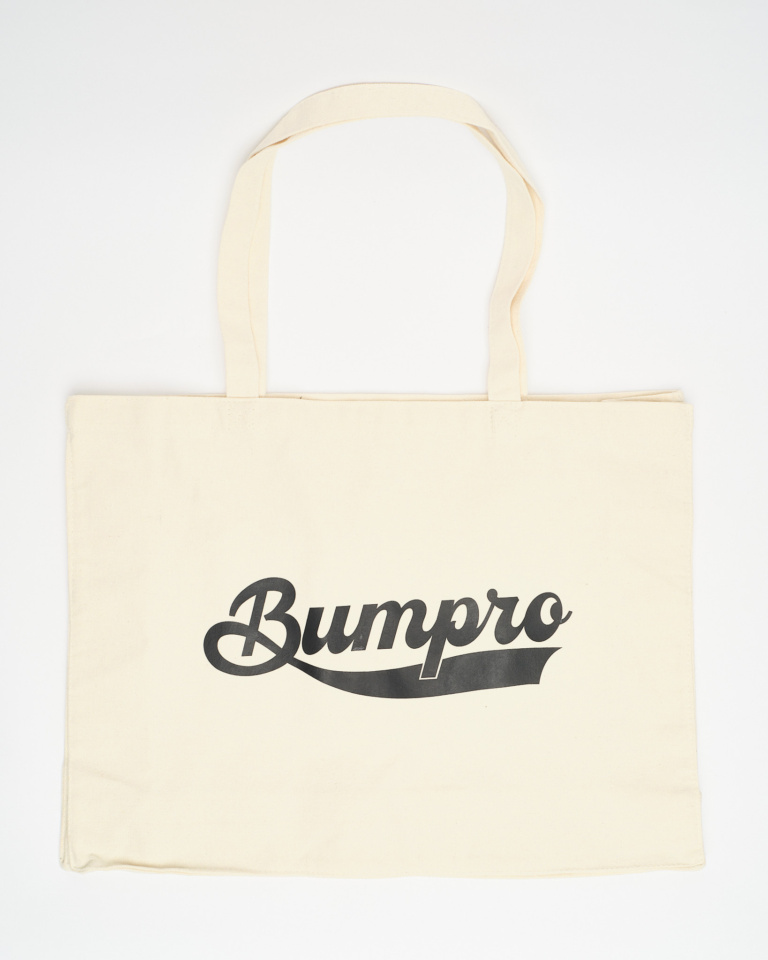 Trendy og fin totebag med old-school Bumpro logo. Vesken er større enn vanlige totebags. I denne vesken finnes ingen lommer. Superfin til alle mulige antrekk eller på vei til gymmen. Her har du plass til både sko, toalettsaker og masse mer!