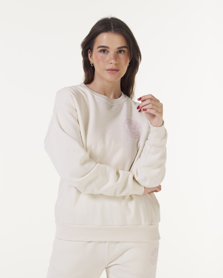 Genser i college/crewneck-design med et sporty stil. Genseren har en rund hals, med halsbånd på innsiden. Den har senkede skuldre som bidrar til sporty utseende og en ribbestrikket linning. I større størrelser vil en kunne få en oversized-look. Sammensetningen av materialet, med høyt innhold av bomull gjør denne genseren svært pustende og behagelig å bruke.