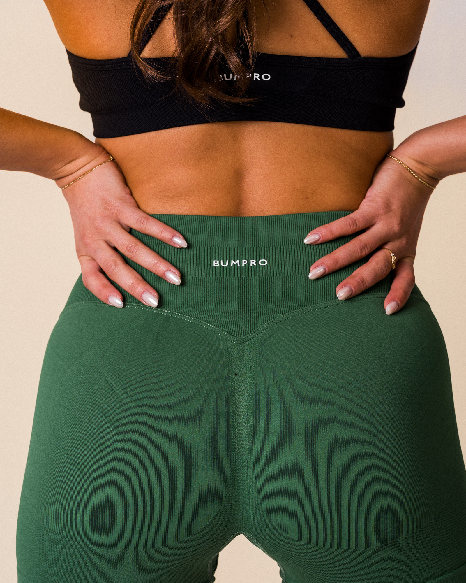 Den ribbestrikkede linningen former midjen og gir en komfortabel og støttende passform. Bak finner du en scrunch-detalj som fremhever formene dine og gir den populære “peachy” looken. Shortsen har også en V-formet linning bak som gir en ekstra flatterende silhuett.