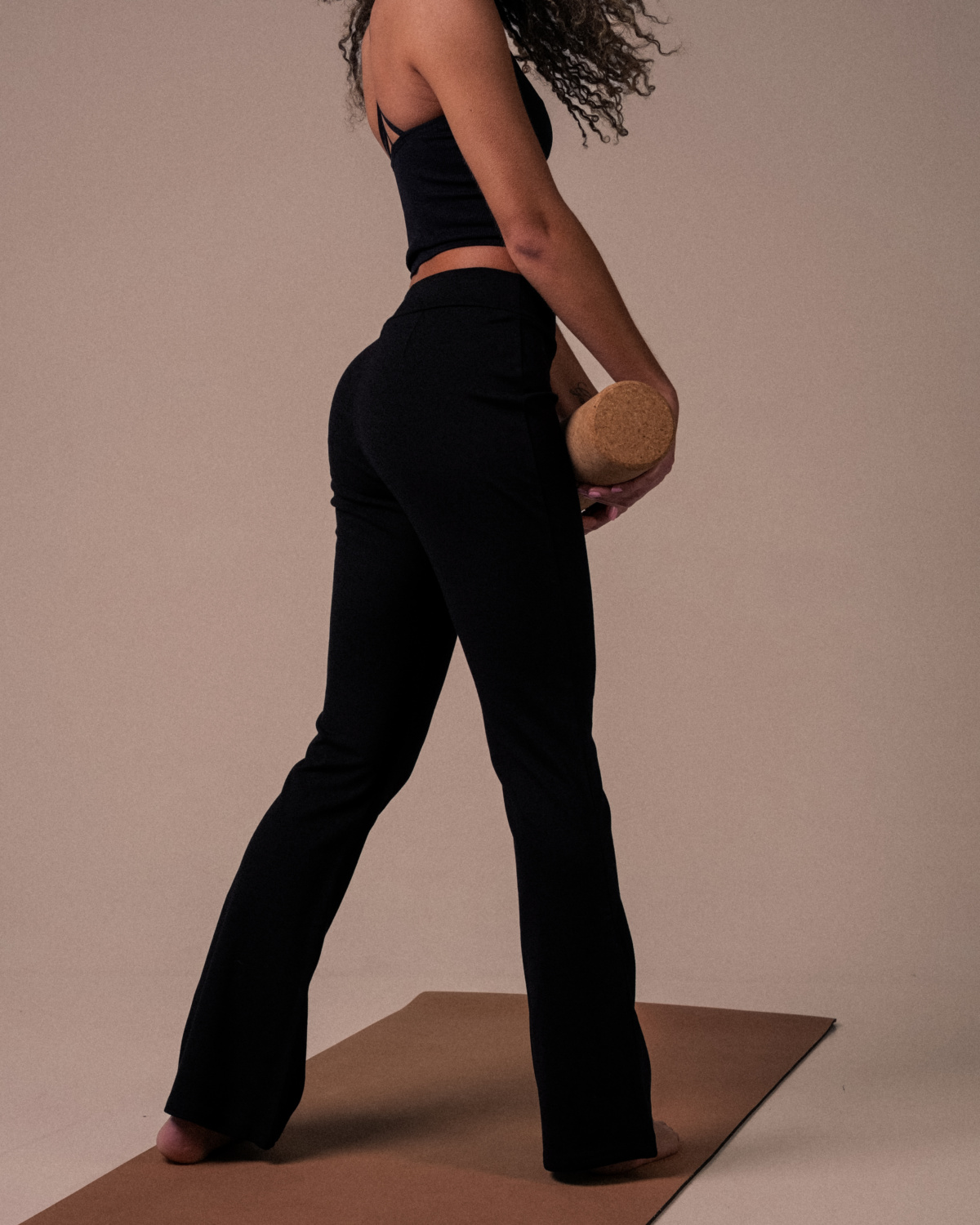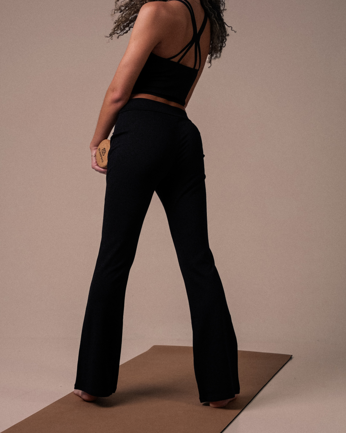 Flare bukser som har et høyt liv som er elastisk og setter seg fint rundt kroppen. Buksene har typisk, gradert passform, hvor øvredel er stramt og gir en flatterende look, mens bena er vide og i flare design. Broddert logo design.