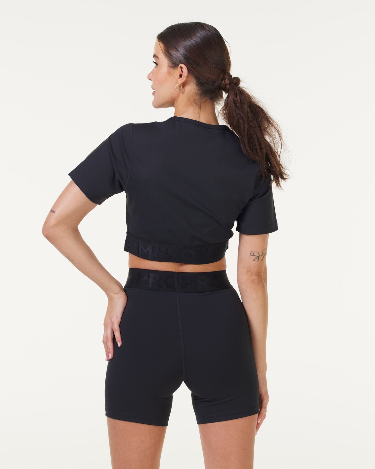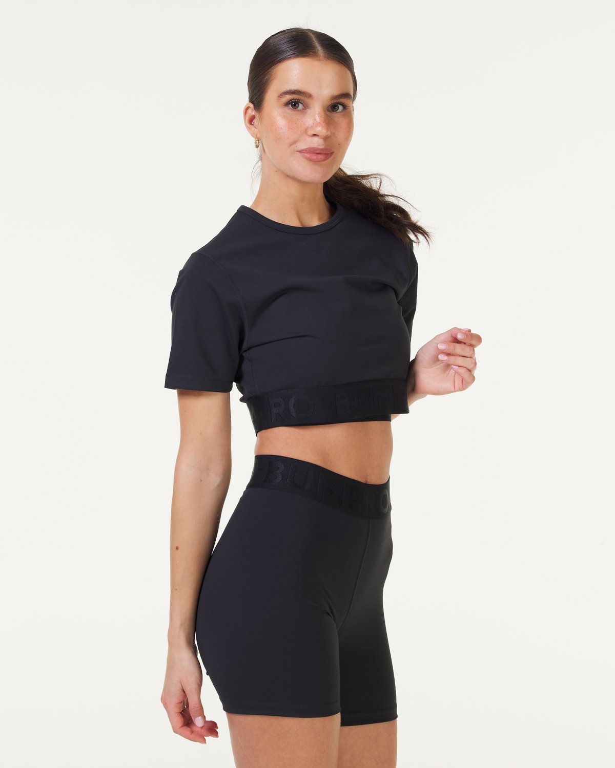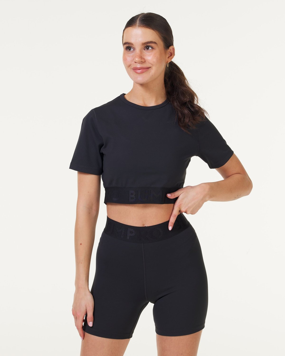 - Bumpro Lively Crop Tee Black: En moderne og tettsittende t-skjorte med en flatterende cropped lengde. Den brede elastikken nederst sørger for at toppen holder seg perfekt på plass uansett bevegelse, mens den blanke logoen gir et eksklusivt preg til det minimalistiske designet.