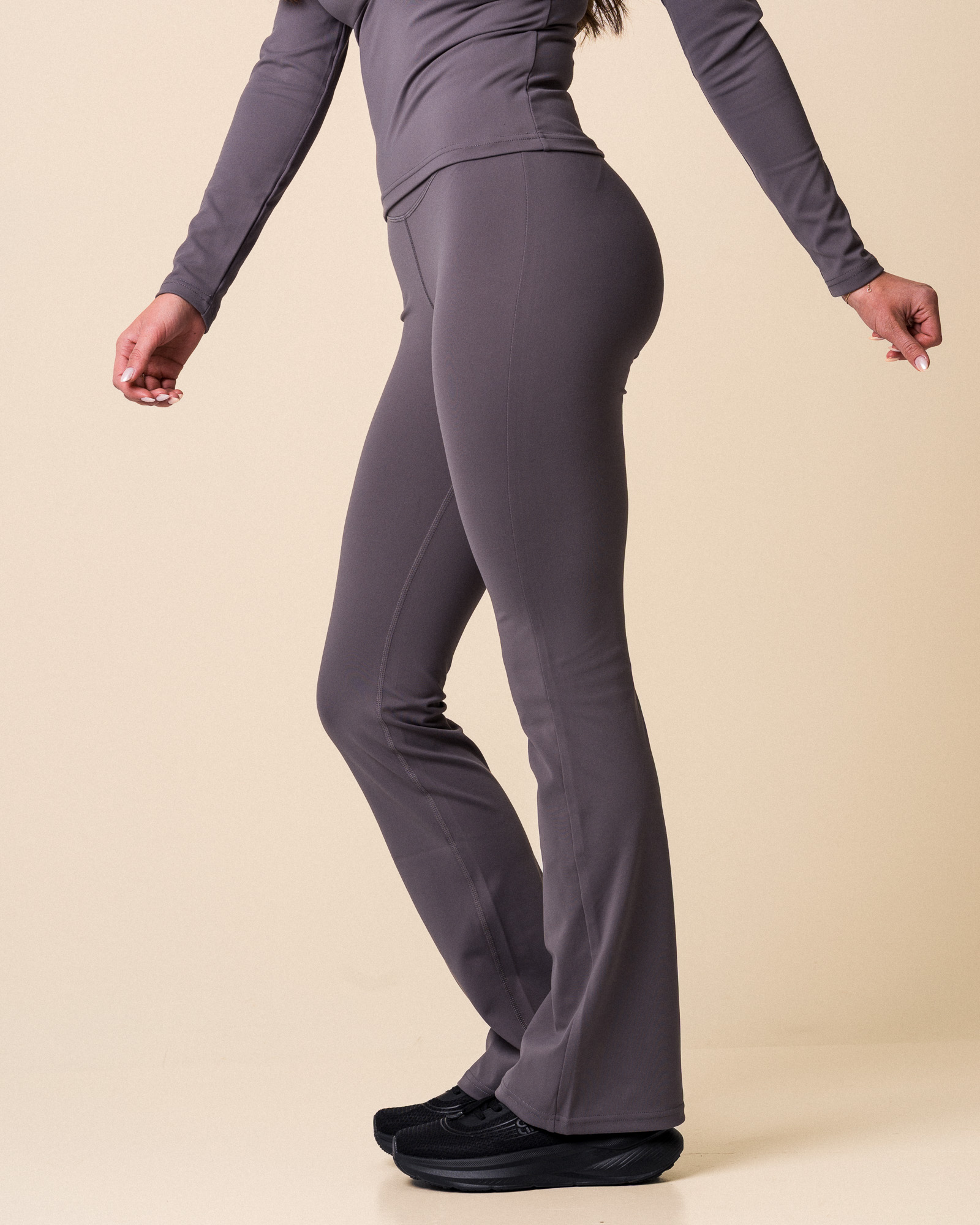 Stilren slengbukse i et utrolig mykt, peachet materiale. V-formet søm foran og bak skaper en smigrende silhuett, og buksen har et lett utsving nederst ved bena. Den passer perfekt til studiotrening som pilates eller yoga, til økter på treningssenteret – men er også superfin til hverdags! Føles som en drøm både å trene og gå i.