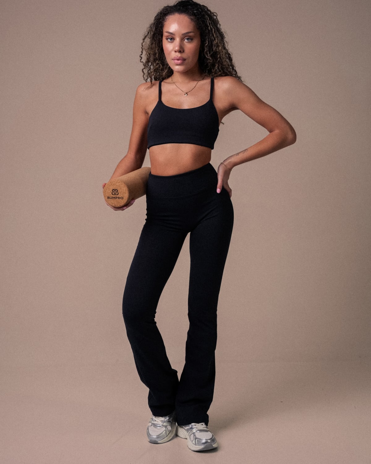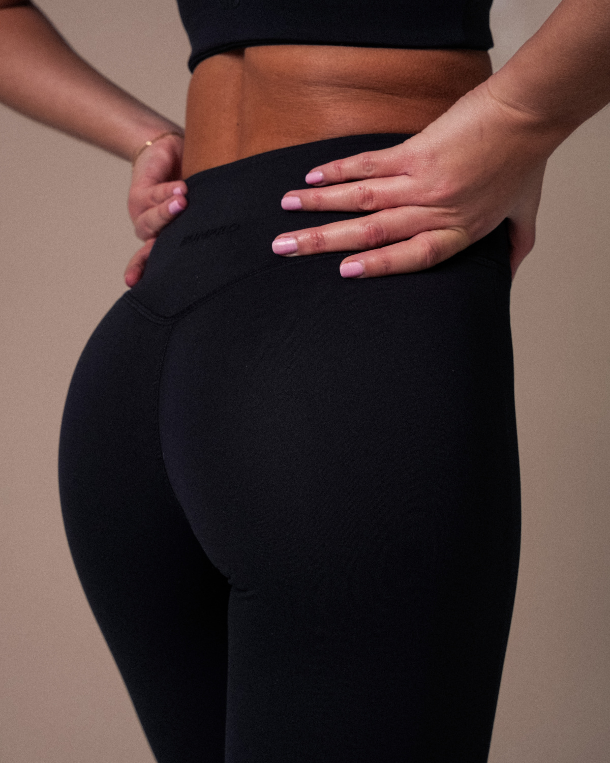 Stilren flare-bukse i et utrolig mykt, peachet materiale. Designet uten frontsøm for å unngå «cameltoe»-effekt. Den har en V-formet bakside som skaper en smigrende silhuett, og et lett utsving nederst ved bena. Buksa passer perfekt til studiotrening som pilates eller yoga, til økter på treningssenteret – men er også superfin til hverdags! Føles som en drøm både å trene og gå i.