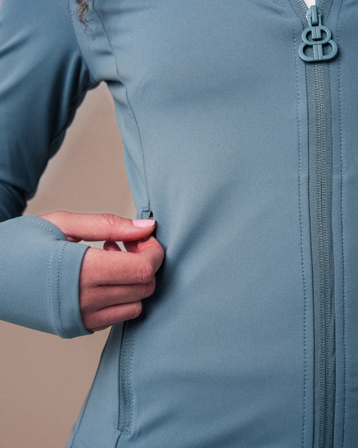 Supertrendy zip up jakke med bumpro logo på glidelåsen. Denne jakken passer perfekt til både styrkeøkter, turer ute og til hverdags. Takket være strechy stoff sitter denne jakken som et skudd og gir en flatterende look. Jakken har 2 lommer foran og en liten Bumpro logo øverst på ryggen.