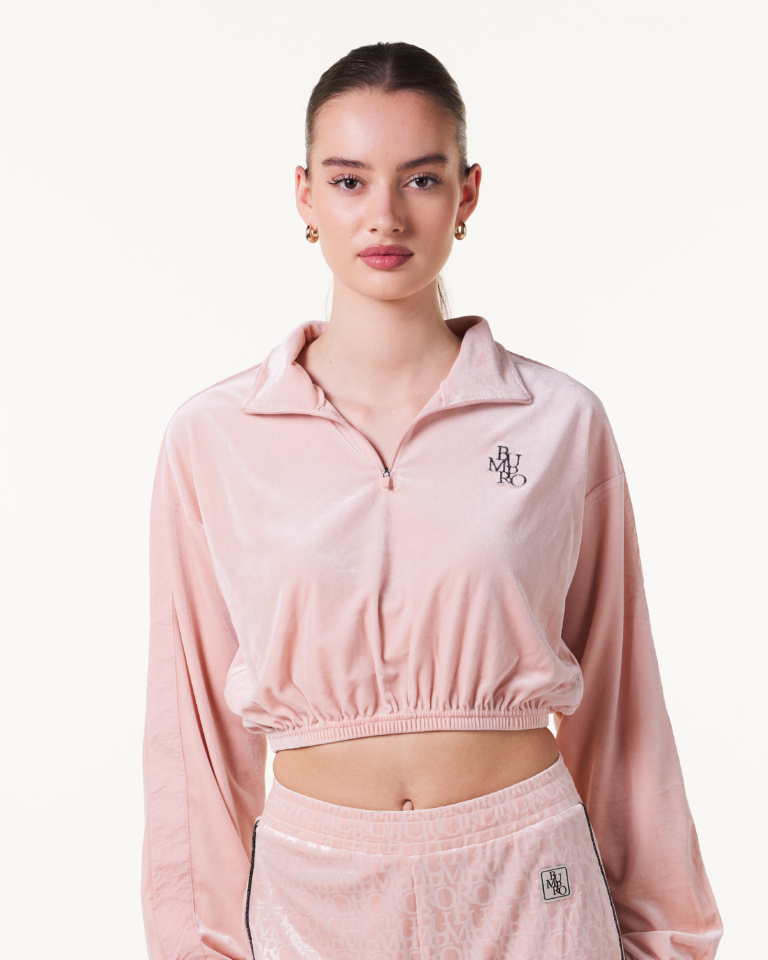 Høyhalset jakke med halvveis glidelås. Kommer i utrolig fin fløyelsstoff. Linningen er trukket, elastisk og strammer livet og sitter godt rundt. Veldig pen og stilren design, kun en liten logo øverst på venstre bryst. Myk og behagelig stoff med høyt bomullinnhold.