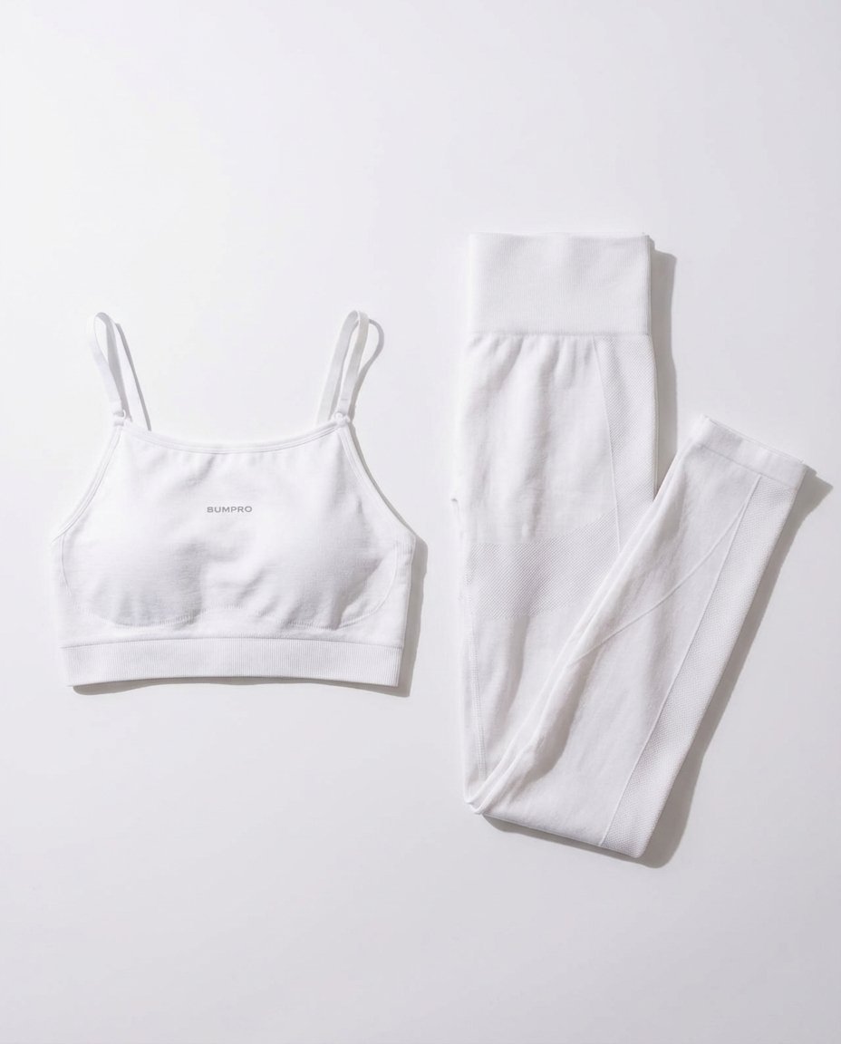 For å fullføre stilen inneholder pakken Bumpro Power Up! Tights White. Denne tightsen er kjent for sin unike evne til å fremheve kroppens former. Med et støttende, høyt waistband får du en flatterende feminin silhuett og en passform som sitter som støpt, enten du fokuserer på dype knebøy eller bevegelighetstrening.