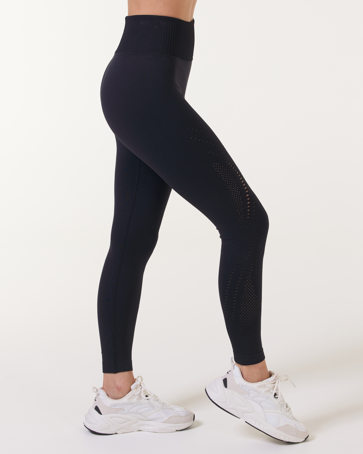 Sømløs, yoga vennlig tights som gir deg en stram og fleksibel passform. Med høy ribbestrikket midje som justerer seg etter kroppen. Meshbaserte og vanlige hullstrikk på siden, som går fra midjen og helt ned til beinet. Flatlock søm som går ned i midten av baksiden. Utenom en logo på ytterste på venstre side av hoften, er den stilren. Gir deg støtten du trenger og holder deg sval gjennom økten.