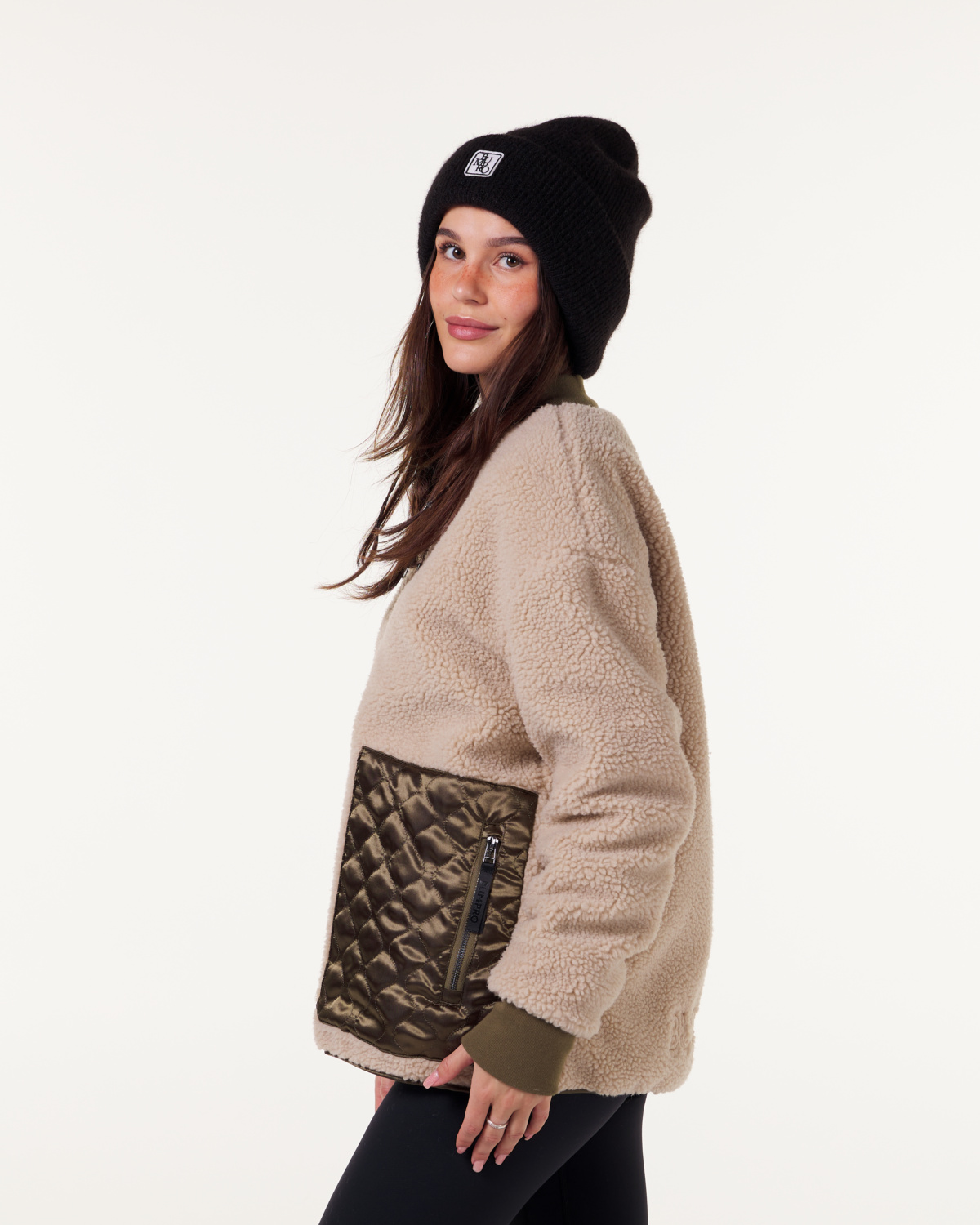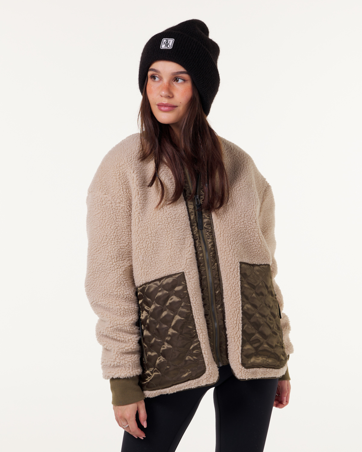 Skikkelig stilig jakke i børstet fleece. Jakken har en V-formet hals med ribbestrikket konstruksjon, du finner glidelås hele veien ned, hvor glidelåsen er på et annet materiale enn børstet fleece. Med senkede skuldre og vertikale sidelommer med glidelås. Mansjetter på enden av ermet i ribbestrikk. Linningen er lengre bak, og har runde kanter der glidelåsen starter.