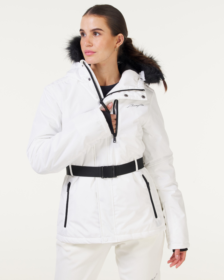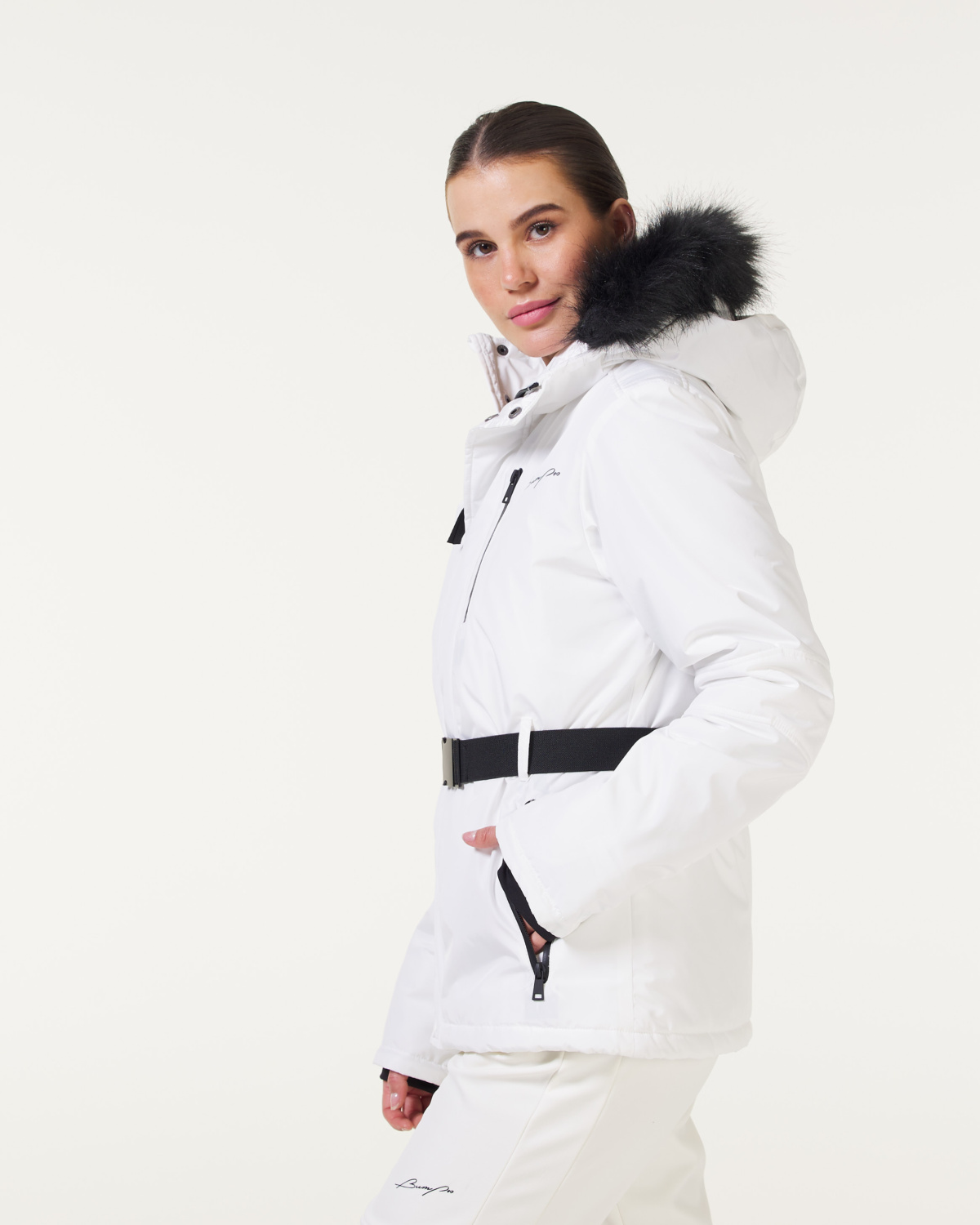 Flatterende jakke med belte i midjen som gir en stilig og behagelig passform. Perfekt til utendørs aktivitet både i alpin bakken og andre aktiviteter. Faux fur som er avtagbar og jakken har lommer innvendig og utvendig. Hette med justerbar strikk, glidelås med klaff og knapper. Jakken er impregnert med en vannavvisende behandling uten tilsatte perfluorerte stoffer (PFC) og som er mer miljøvennlig enn tilsvarende behandlinger.