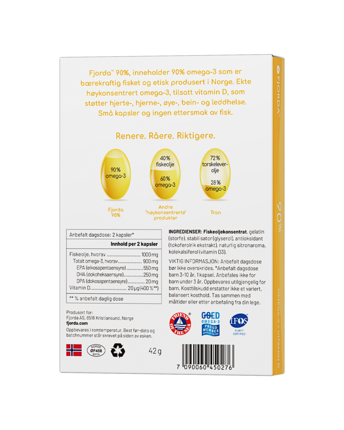 Fjorda 90% er ikke hvilken som helst omega-3, men inneholder minst 90 % omega-3 og er tilsatt vitamin D. På en måte er det en trippel dose "tran"* uten smaken av fisk.