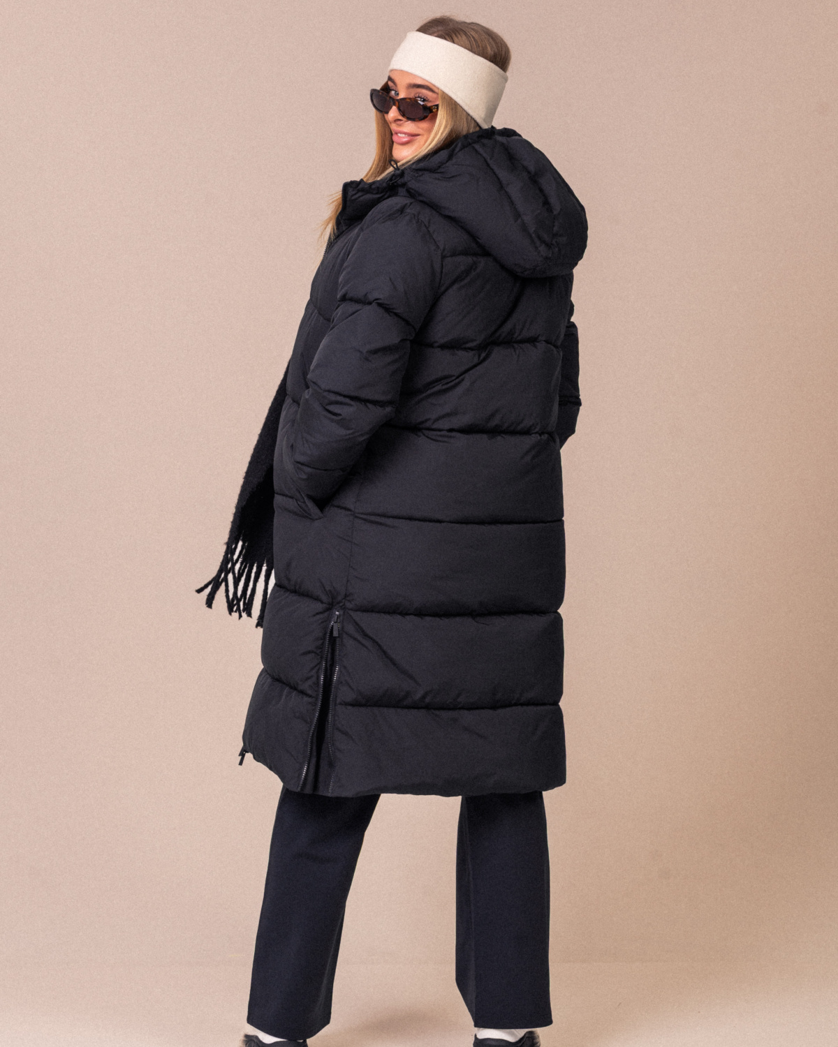 Veldig komfortabel og fin pufferparka i long versjon – to sidelommer, hette med snøring og jakken har glidelås som går hele veien ned. Parkan går ned til leggen, der finner du splitt på hver av de ytterste sidene, de kan åpnes opp og justeres med glidelås. Jakken er varm og passer fint som jakke om høsten og vinteren. Passer å bruke til utrolig mange antrekk og er et skikkelig fint tillegg til garderoben!