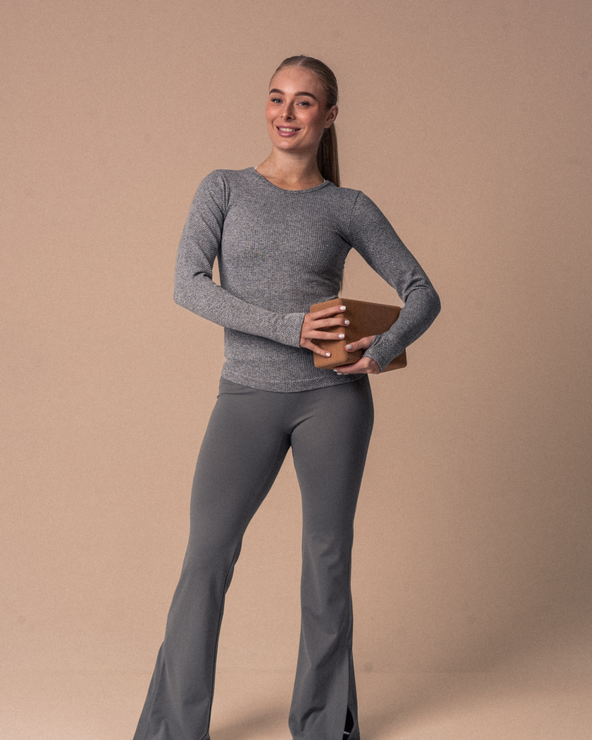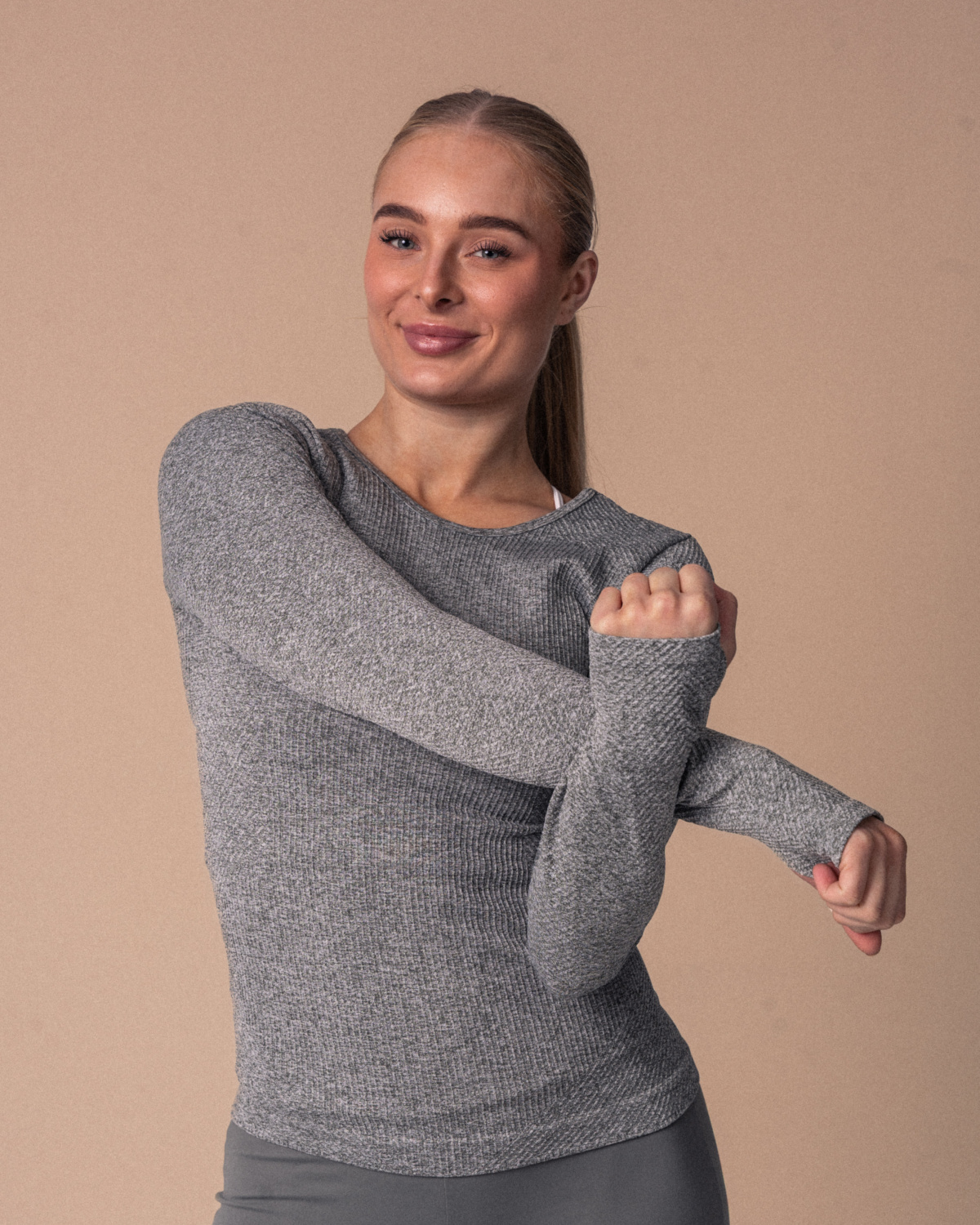 Sømløs genser som passer fint til aktiviteter som yoga, barre, pilates og ballet. Den har ribbestrikkede detaljer med fiskebeinstruktur. Rund hals med elastisk bånd rundt, samt tommelhull nederst på ermene, og en liten print øverst i midten bak.