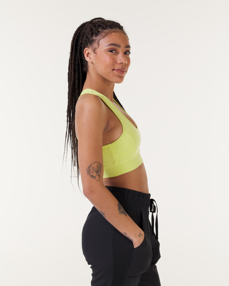 Sports-BH med rund hals og stropper som krysser på baksiden og stram i passformen. L-logo på venstre bryst og “Vent.Ctrl” print nederst på kanten bak. BHen er laget for deg som driver med sport og passer uansett aktivitetsnivå, med medium støtte og avtagbar polstring. Laget av mykt, elastisk og pustende materiale som holder deg sval og tørr. Breeze" hentyder til de gode pusteegenskapene.