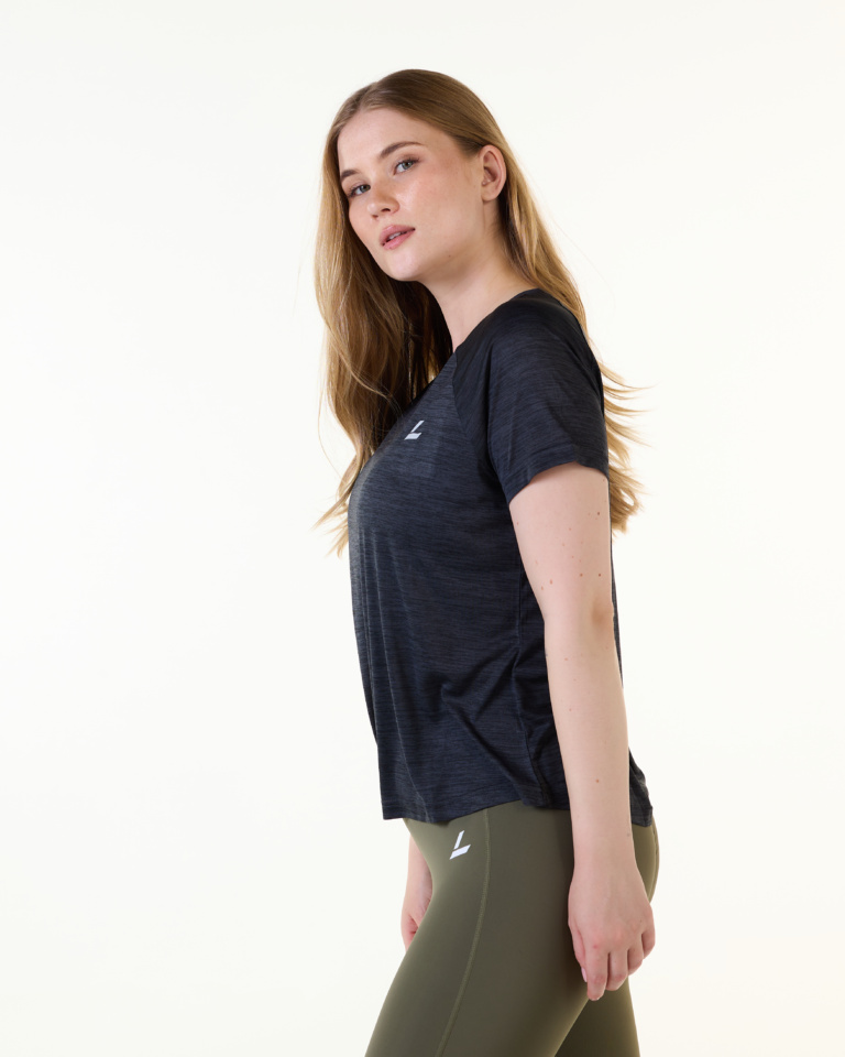 T-skjorte som holder deg sval gjennom treningsøkten. Rund hals med ribbestrikket kant rundt. Buet kant nederst, hvor den bakerste kanten er litt lengre og sidene går litt innover. T-skjorten har en løs passform og kommer i mykt materiale som gjør denne svært behagelig i bruk. Kun en liten L-logo på venstre bryst.
