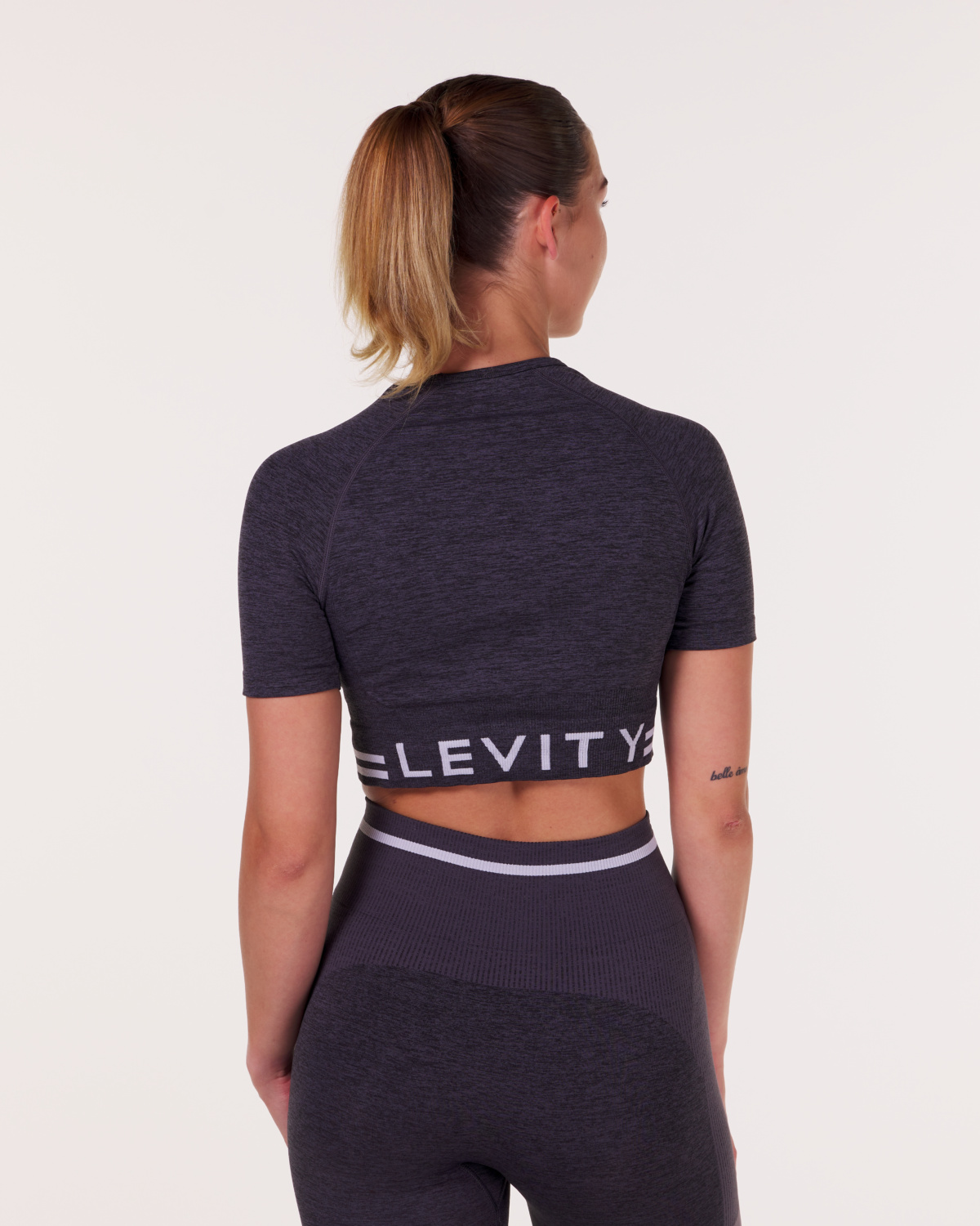 Cropped trenings t-skjorte som er forkortet i den nederste delen og sømløs, med ermer som er litt lengre enn en vanlig t-skjorte. Med rund hals og en stram passform, og ribbestrikkede detaljer i midjen og på sidene. Du finner en liten L-logo på venstre bryst og en “Levity”-print nederst på baksiden.
