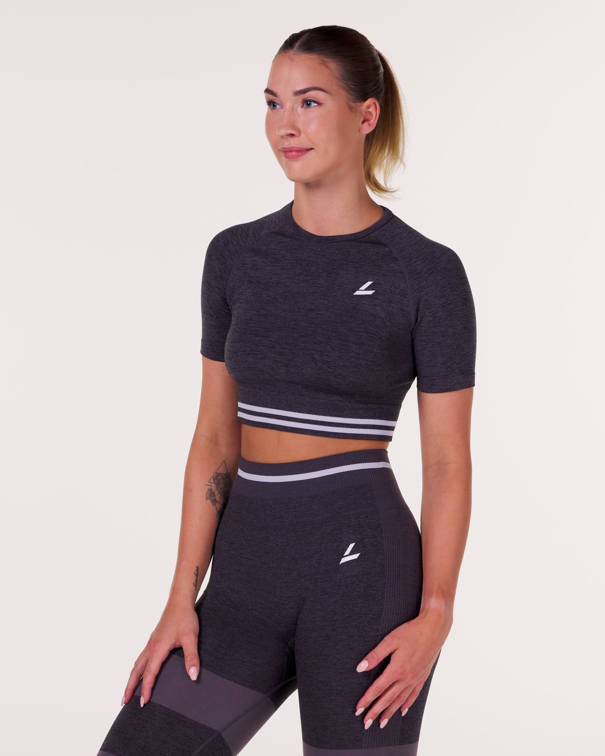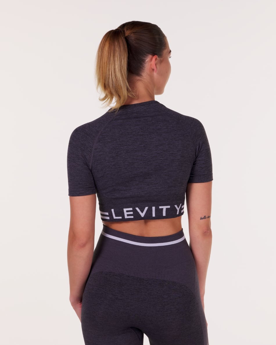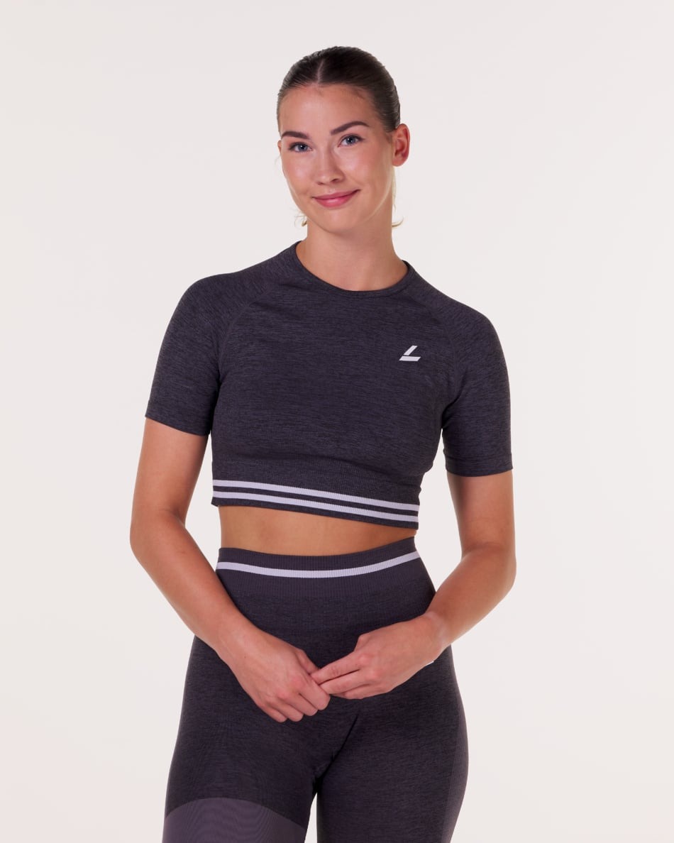 - LEVITY Gravity Logo Seamless Crop Tee Grey Iron Marl: Fullfør stilen med denne moderne t-skjorten. Med sin korte, croppede lengde og stramme passform fremhever den figuren på en sporty måte. Den har rund hals, litt lengre ermer enn vanlige t-skjorter og ribbestrikkede detaljer som matcher tightsen perfekt. Den ikoniske L-logoen på brystet gir settet et eksklusivt preg.