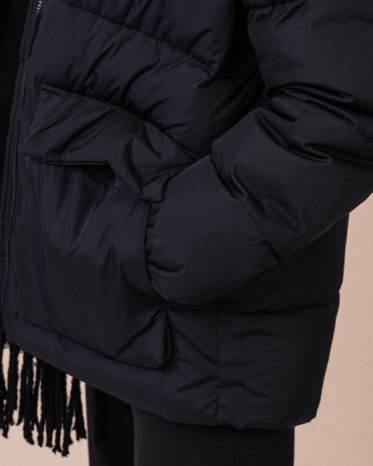 Supertrendy puffy og behagelig jakke, perfekt til høsten og vinteren! Denne jakken vil du holde deg god og varm i gjennom de kaldeste dagene. Stilren og perfekt til hvilke som helst antrekk. Jakken har lommer foran, som kan lukkes slik at ting ikke faller ut. Den har også glidelås og knapper i front. Jakken har også en stor og fin avtakbar hette.