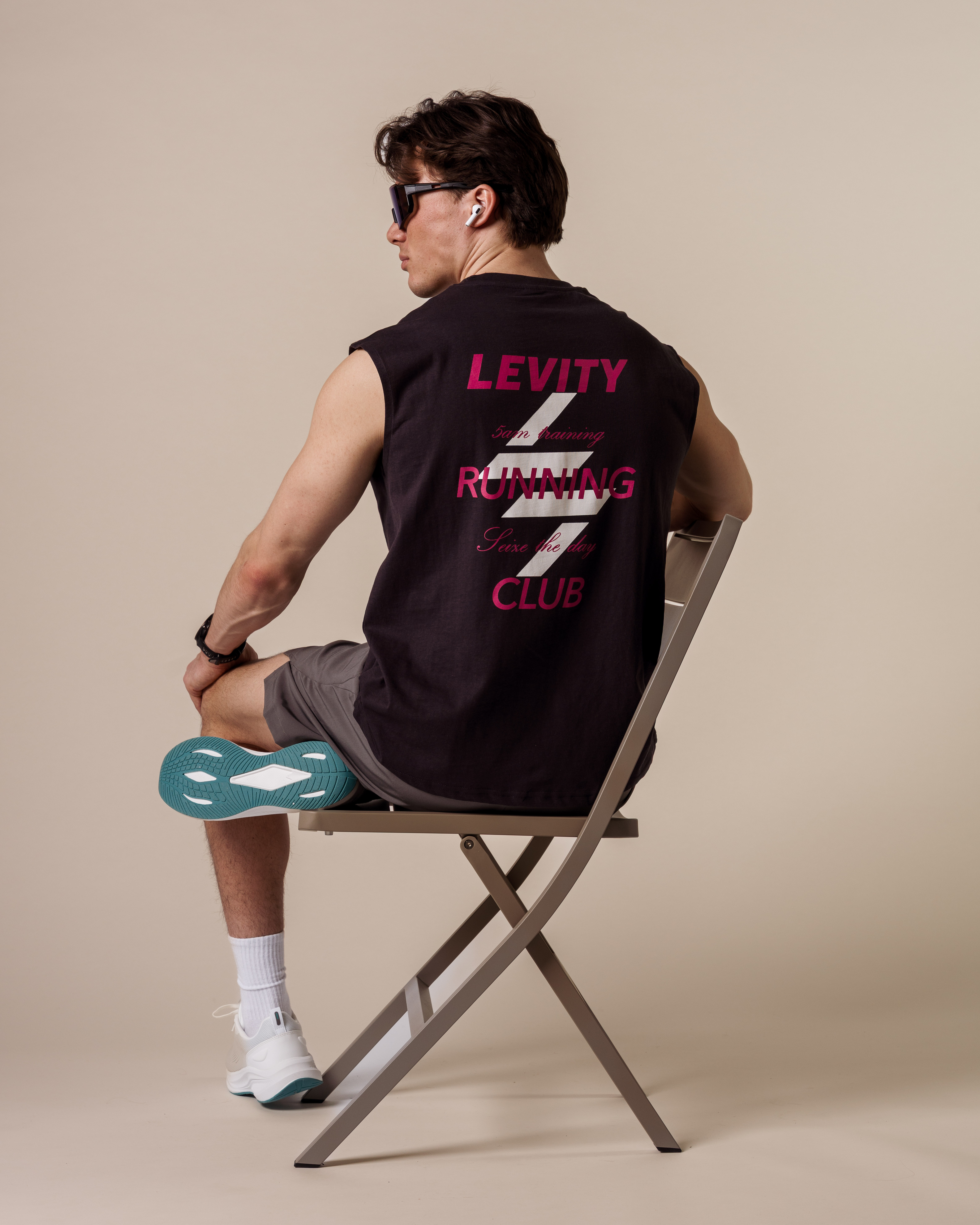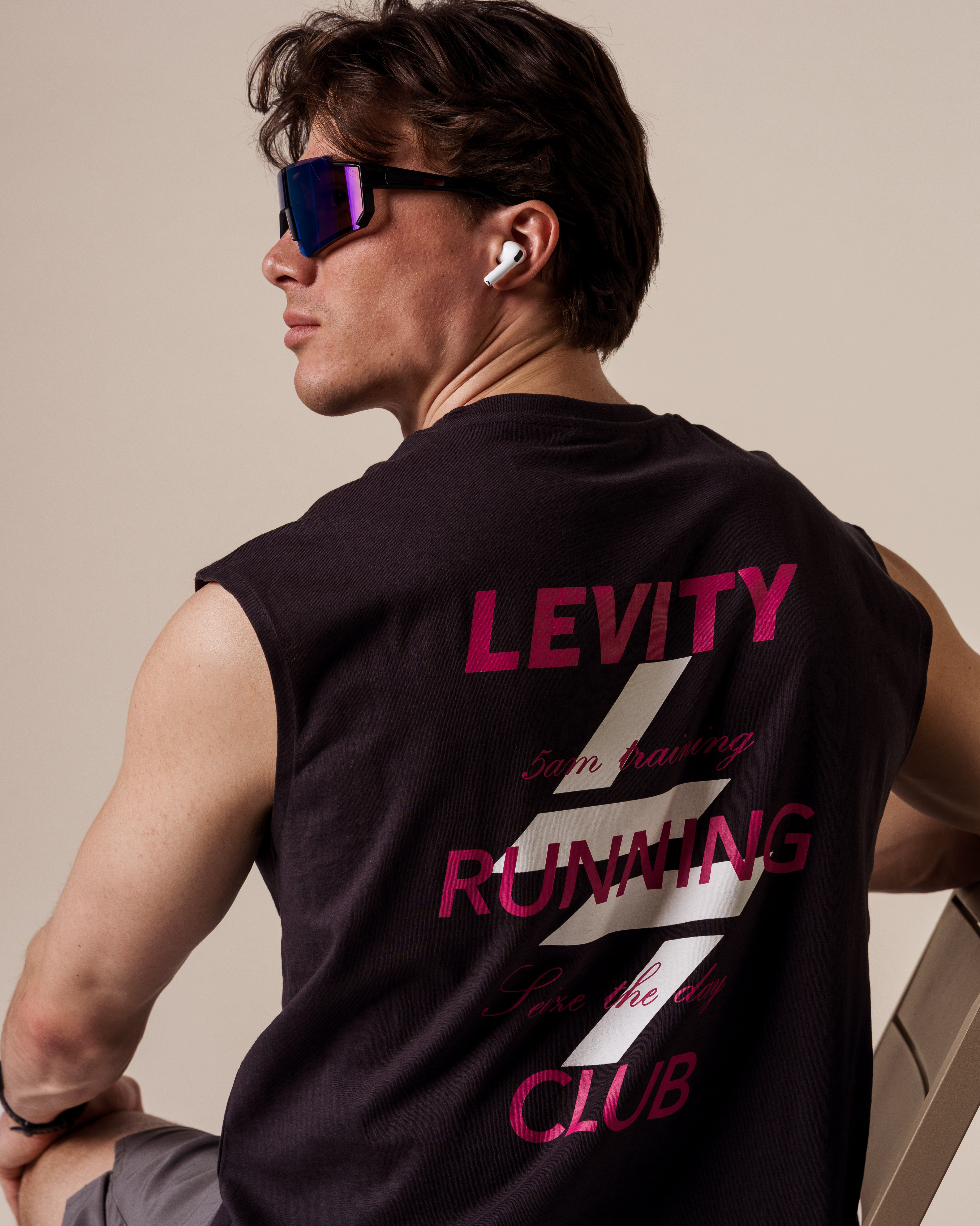 Den ermeløse designen gir god bevegelsesfrihet og ventilasjon når intensiteten øker, mens det myke bomullsmaterialet føles behagelig mot huden gjennom hele dagen. Det stilrene designet kompletteres av et stort trykk på ryggen med teksten “Levity Running Club – Seize the day”, som gir en aktiv og inspirerende følelse.