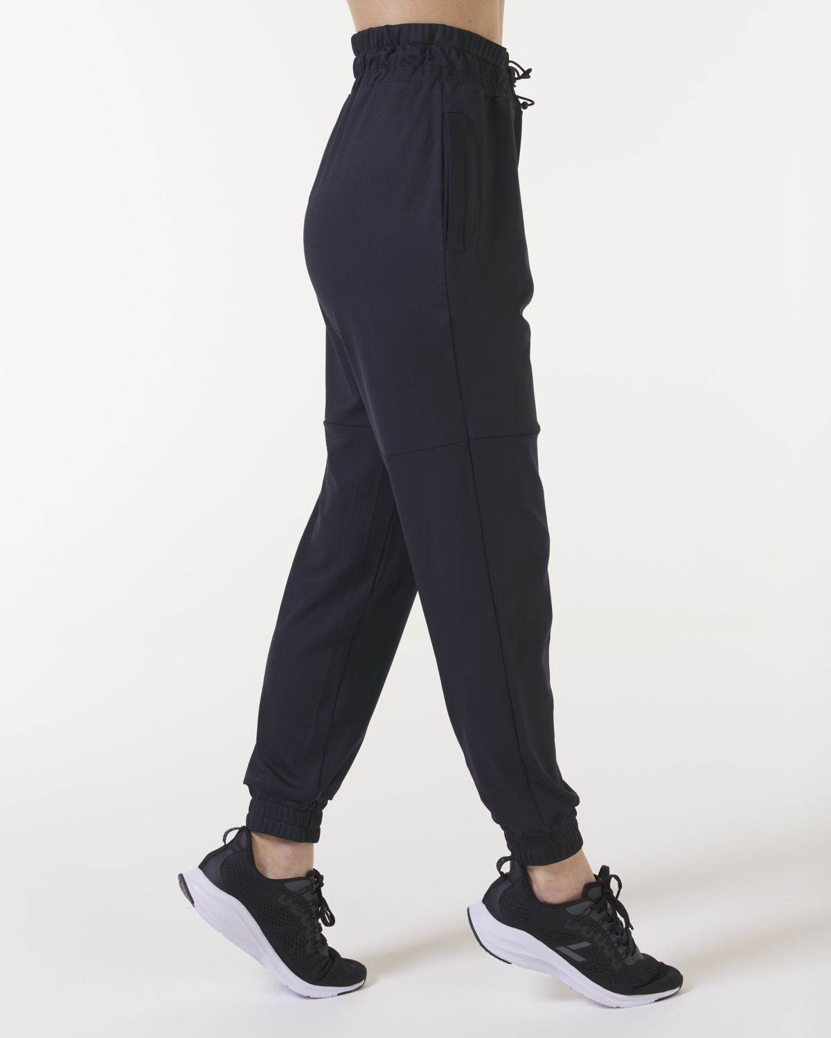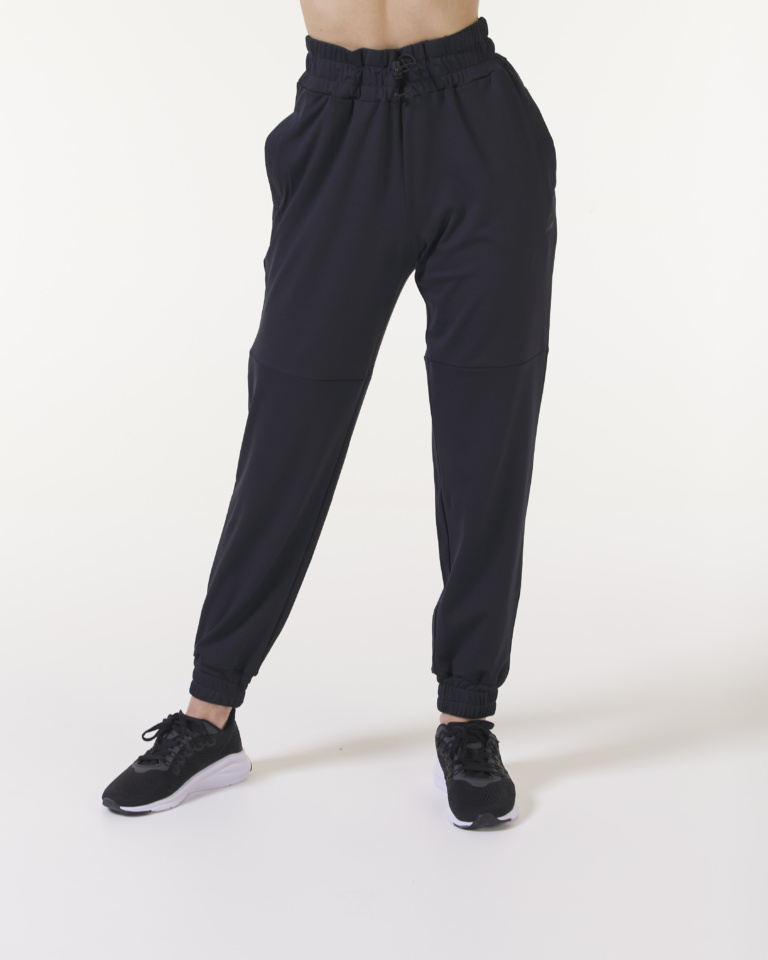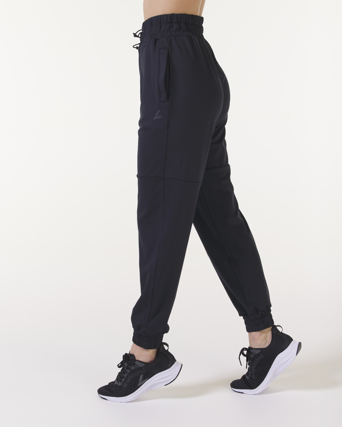 Joggers, myke joggebukser, med en myk innside. Stram passform med elastisk bånd og snøring i den høye midjen, og trukkede sidelommer for å sikre at du ikke mister noe. Den har også trukket elastisk bånd nederst på bena, som en mansjett i tykt materiale. Og søm på tvers over knærne, med en liten L-logo på venstre lår.
