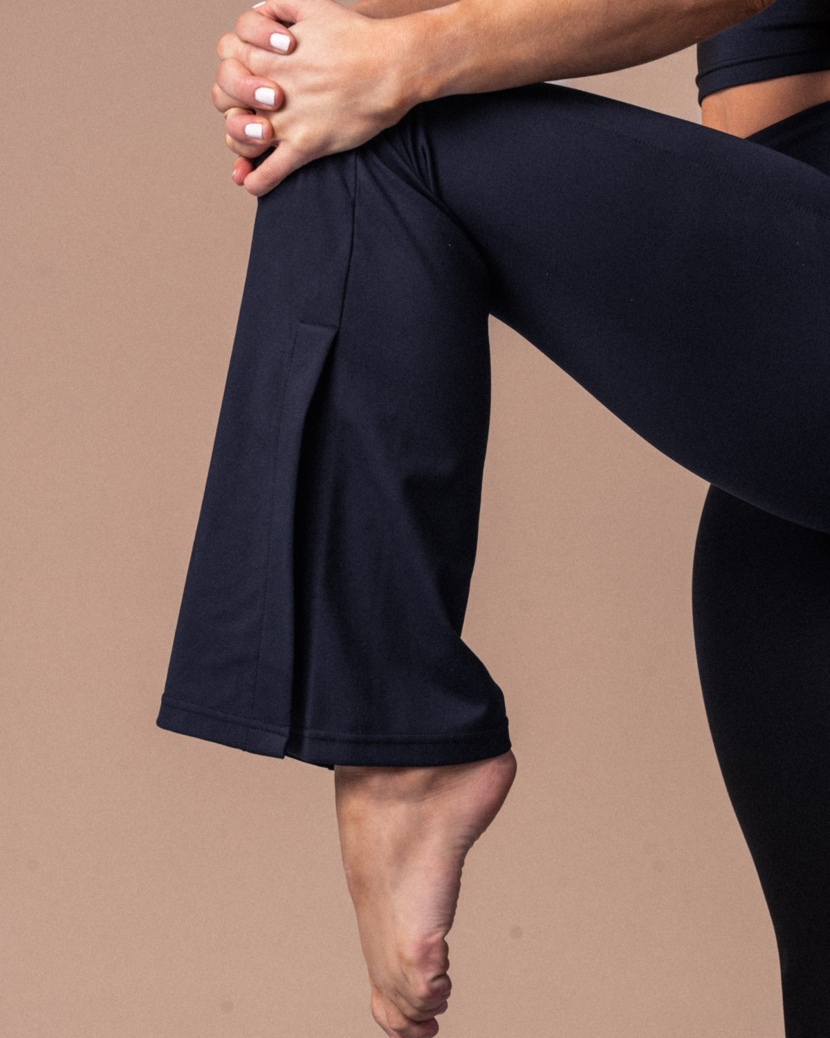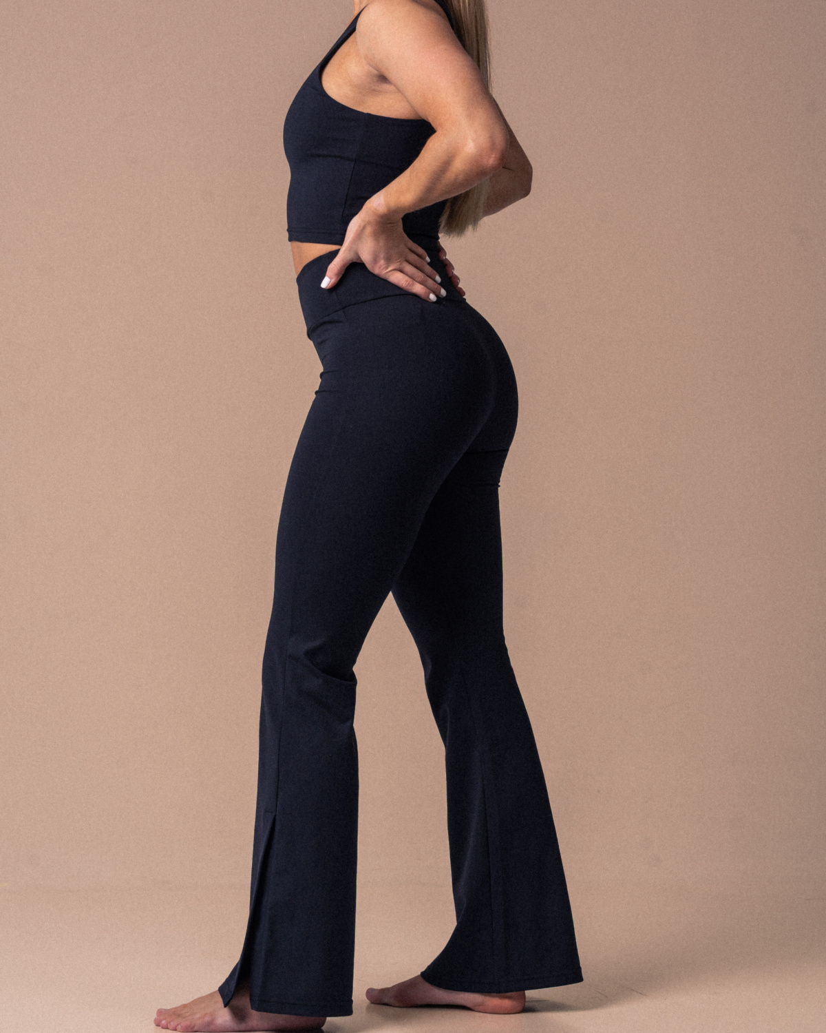 Flatterende "flare"-bukser med splitt nederst. Dobbelt fôret linningen med meshmaterialer gjør buksen behagelig og pustende til alt av aktiviteter. Buksen har flare ben fra midt på leggen og ned. Myk elastikk i midjen og log print bak. Elegant og enkelt design som kan brukes i hverdagen og i aktiviteter.