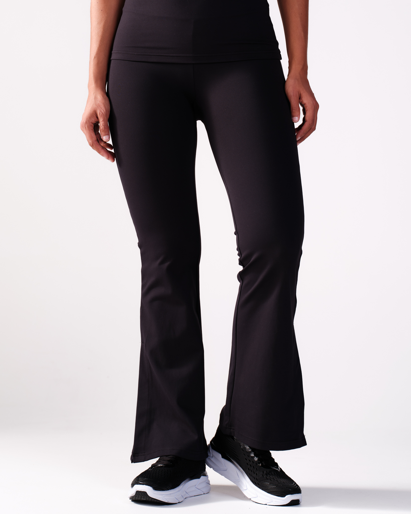 Flatterende "flare"-bukser med splitt nederst. Dobbelt fôret linningen med meshmaterialer gjør buksen behagelig og pustende til alt av aktiviteter. Buksen har flare ben fra midt på leggen og ned. Myk elastikk i midjen og log print bak. Elegant og enkelt design som kan brukes i hverdagen og i aktiviteter.