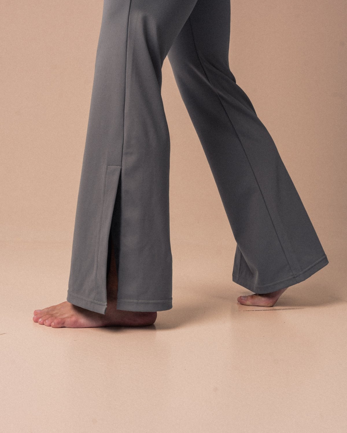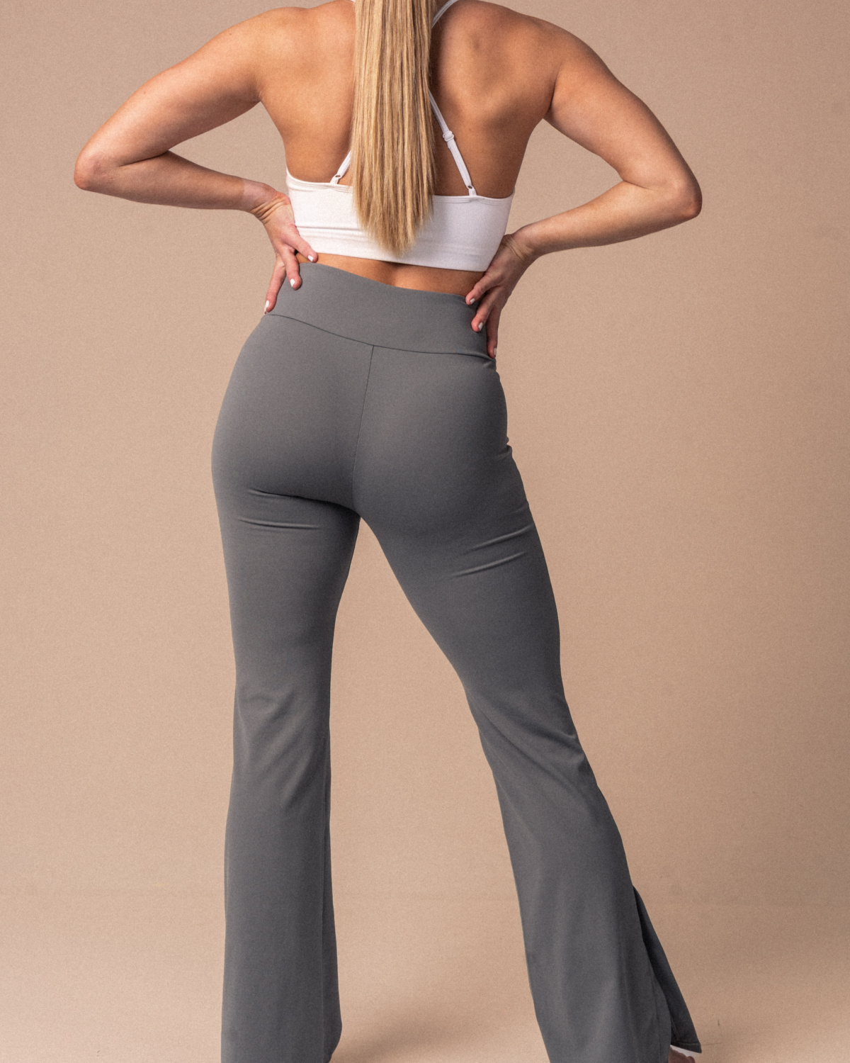 Flatterende "flare"-bukser med splitt nederst. Dobbelt fôret linningen med meshmaterialer gjør buksen behagelig og pustende til alt av aktiviteter. Buksen har flare ben fra midt på leggen og ned. Myk elastikk i midjen og log print bak. Elegant og enkelt design som kan brukes i hverdagen og i aktiviteter.