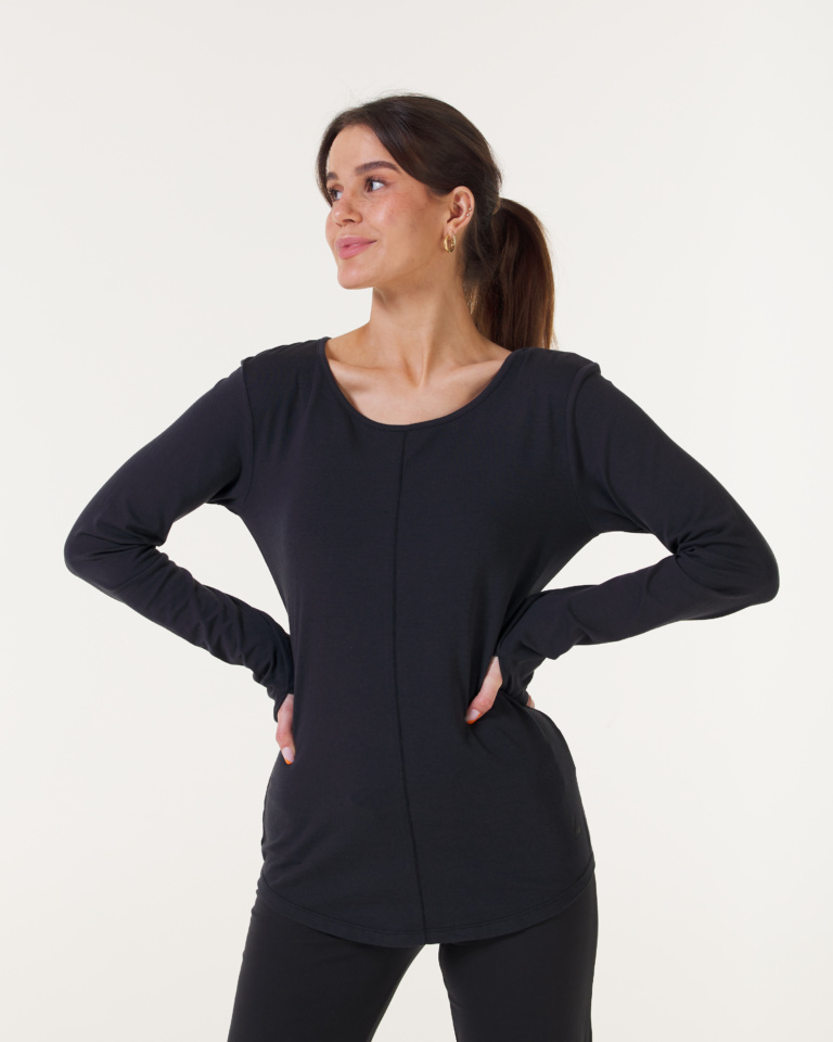 Den har avrundede kanter på bunnen og tommelhull med forsterket kant på ermet. 4-nålers søm med flatlock som går hele veien ned i midten foran, og søm som forsterker linningen, rundt kanten av ermet og rundt kanten av den runde halsen. Kun en liten L-logo nederst på venstre kant. Den har løs passform og er laget i et myk og forbedret materiale med høyt bomull innhold.