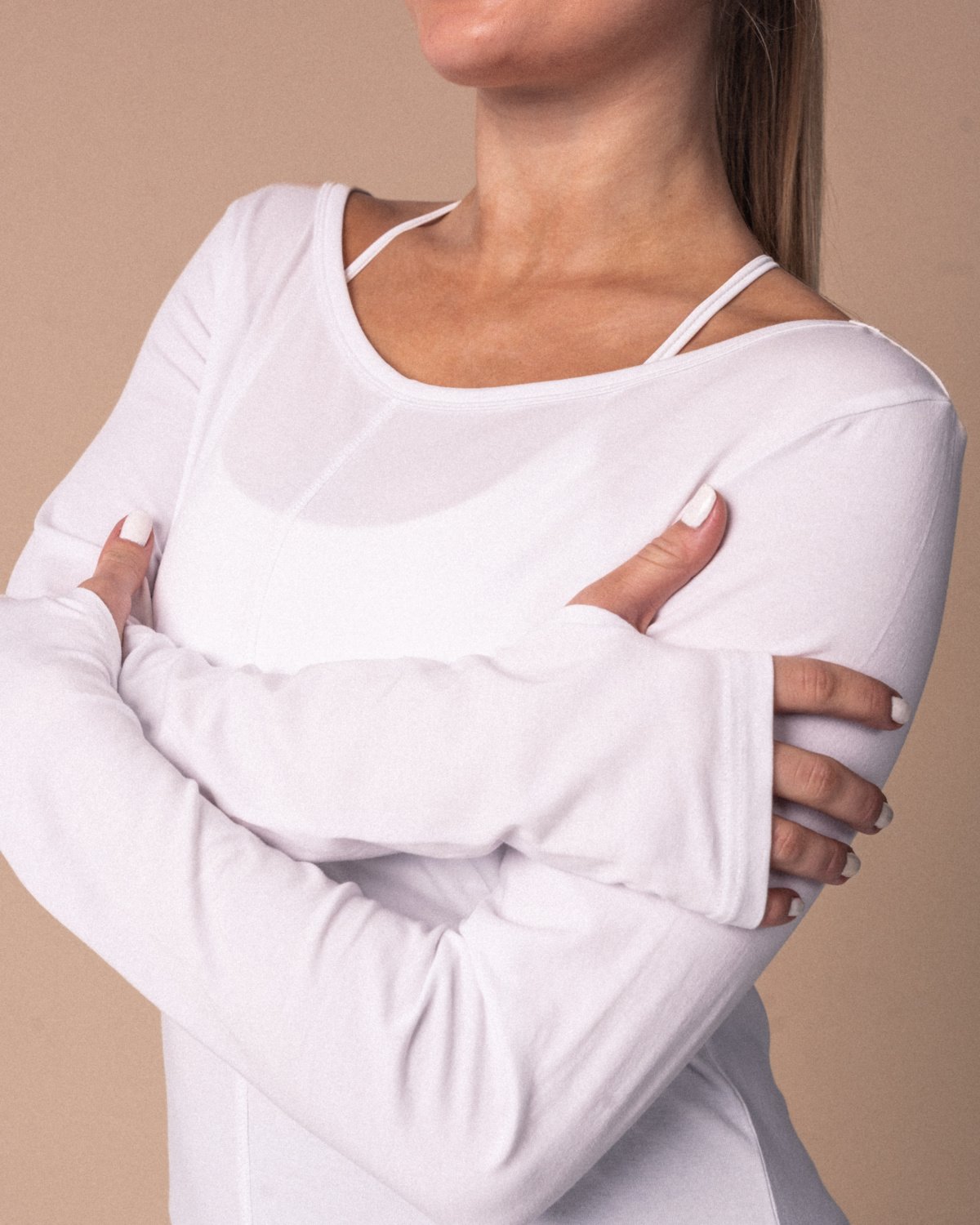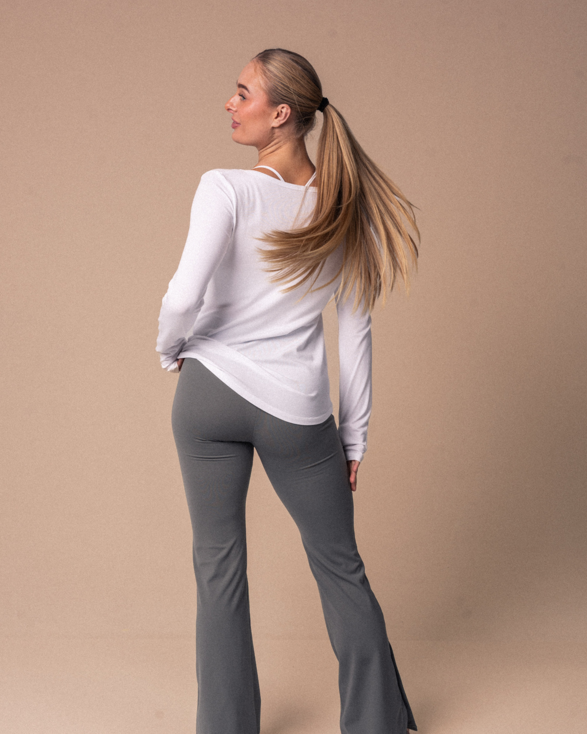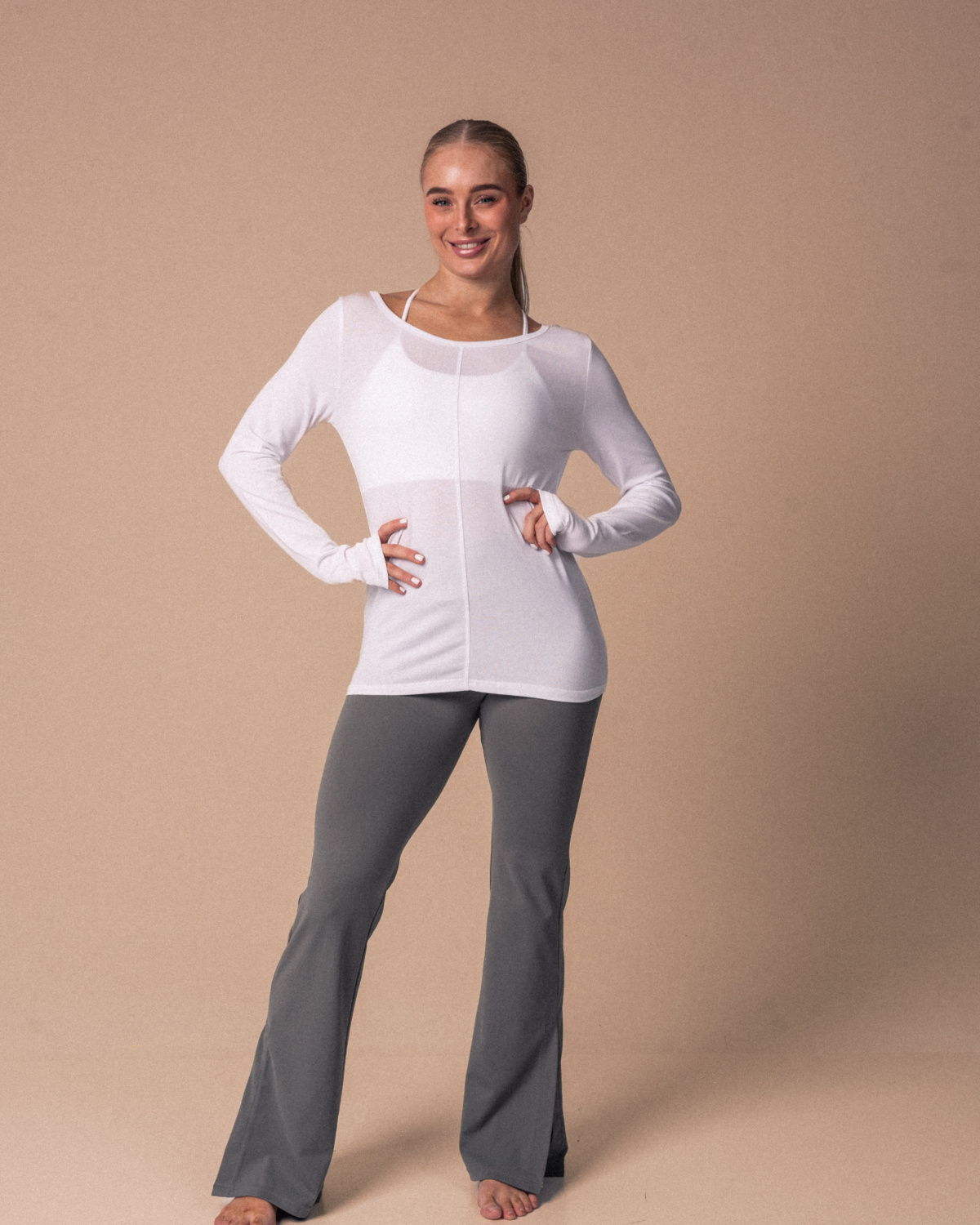 Langermet genser med små avrundede kanter på bunnen og tommelhull på ermene. Laget i et mykt materiale som både kan brukes hjemme eller i yoga-studioet.