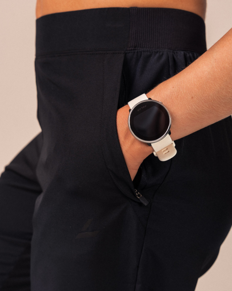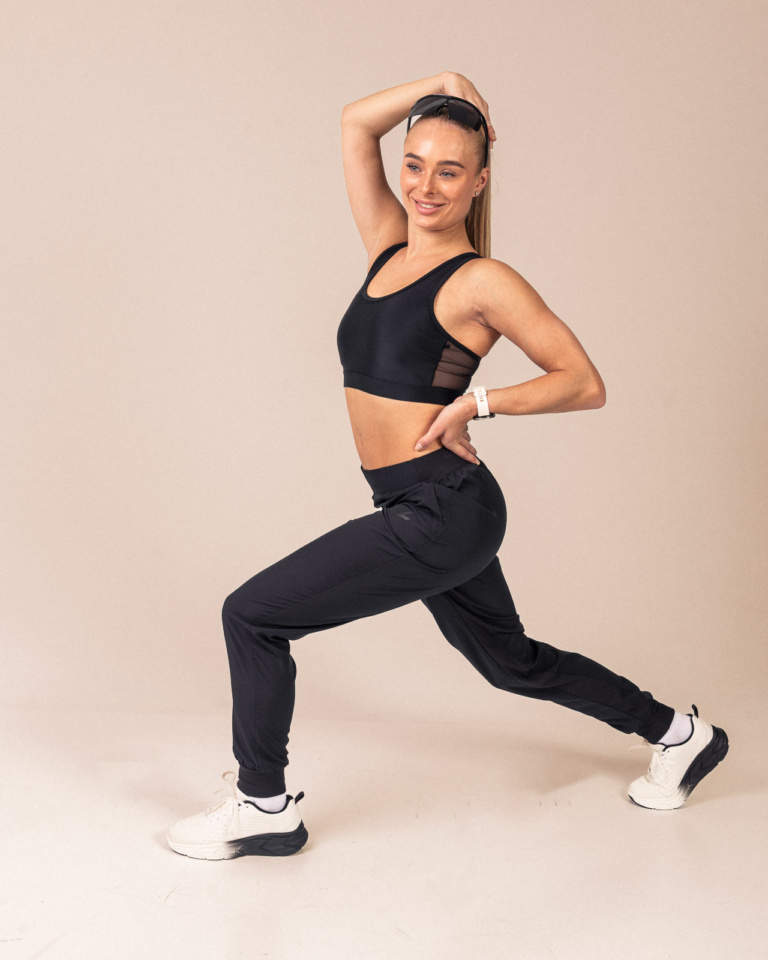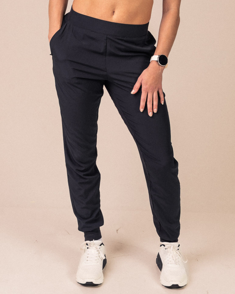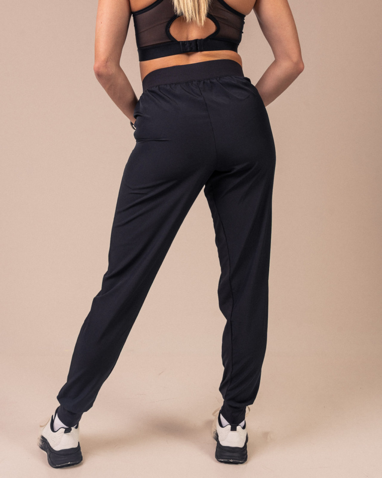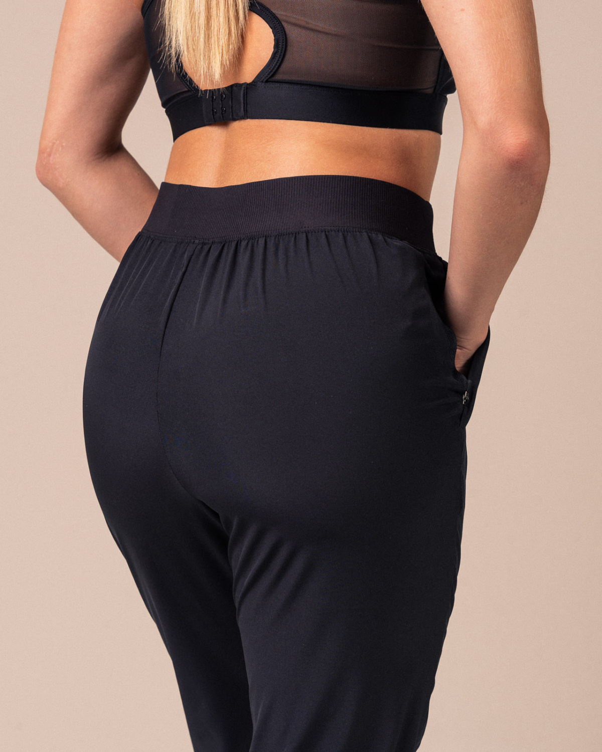 En teknisk treningsbukse med ribbasert bånd på innsiden av benet. Buksen har sidelommer, drawstring på innsiden og mansjetter i benenden.