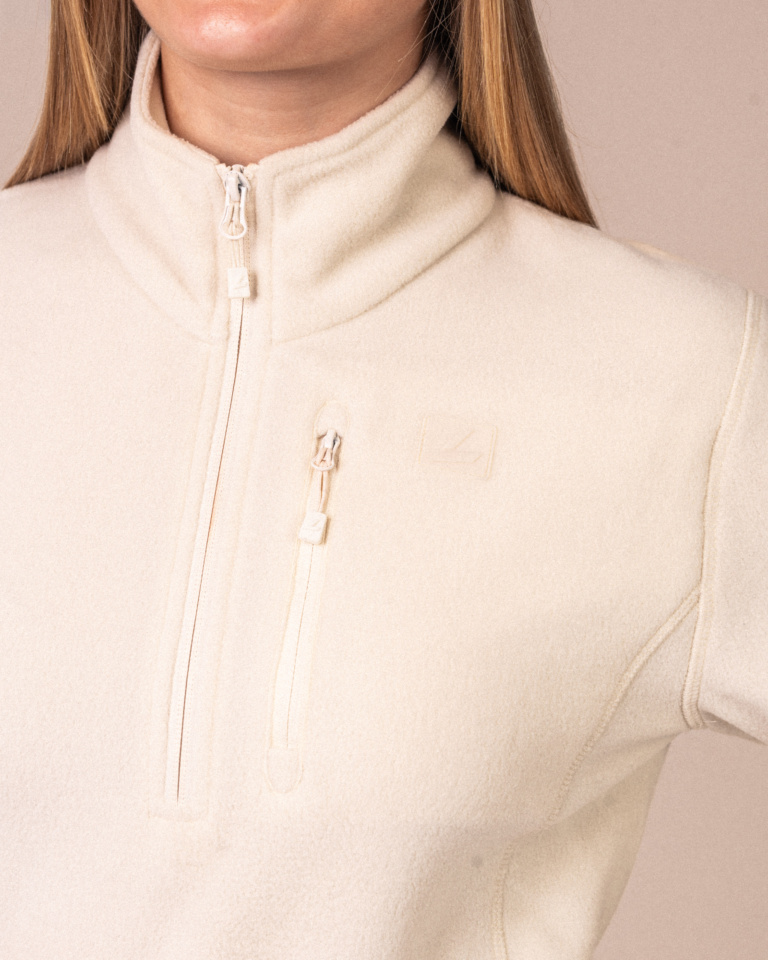 Den praktiske halv glidelås-designen gjør det enkelt å regulere temperaturen, mens den forlengede ryggen og tommelhullene i sidesømmen gir ekstra komfort og bevegelsesfrihet.