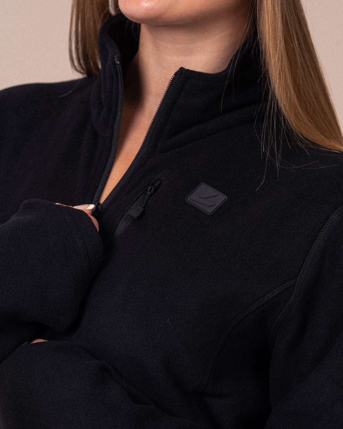 Den praktiske halv glidelås-designen gjør det enkelt å regulere temperaturen, mens den forlengede ryggen og tommelhullene i sidesømmen gir ekstra komfort og bevegelsesfrihet.