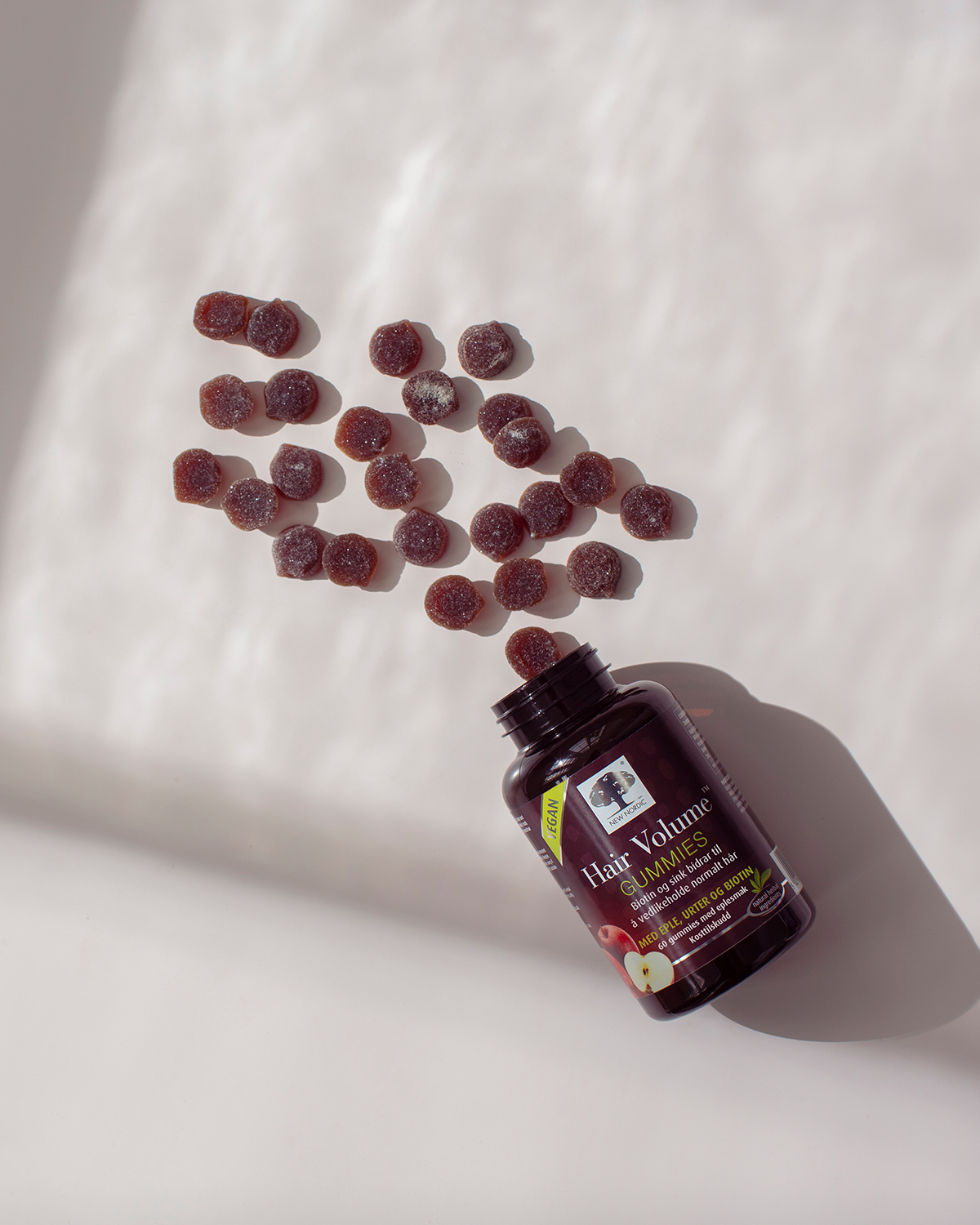 Hair Volume™ Gummies inneholder eple i kombinasjon med hirse, kjerringrokk, biotin og sink, som tilfører næring til hodebunn og hårsekker. Innholdet av biotin og sink bidrar til å opprettholde normalt hår og hud.