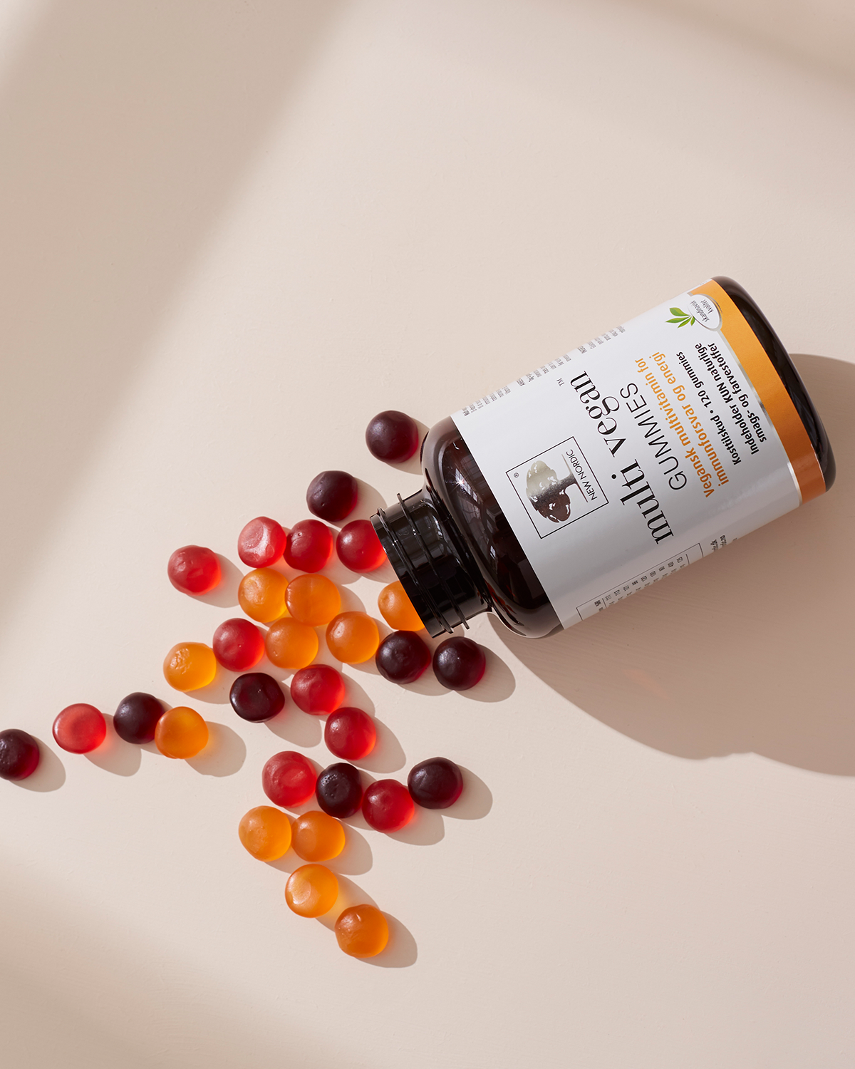 Veganske multivitamingummies med fruktsmak, som inneholder vitaminene A, C, B6, B12, D2 og E samt folsyre, biotin og niacin.