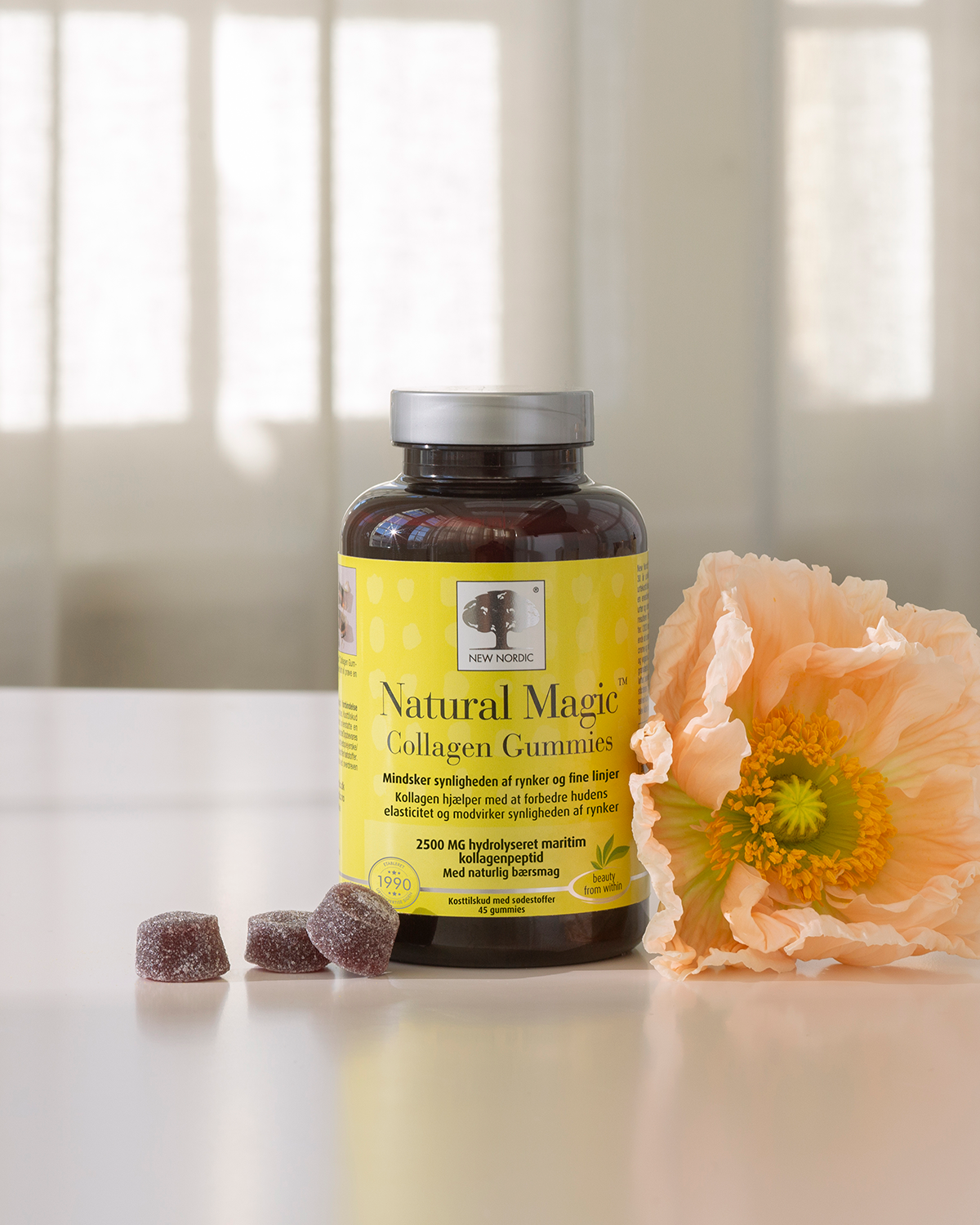 Natural Magic™ Collagen Gummies har en deilig og naturlig smak av bær. Den inneholder 2500 mg hydrolysert kollagenpeptid kombinert med sink. Kollagen bidrar til å bedre hudens elastisitet og motvirke synlige rynker. Sink bidrar til normal hud.