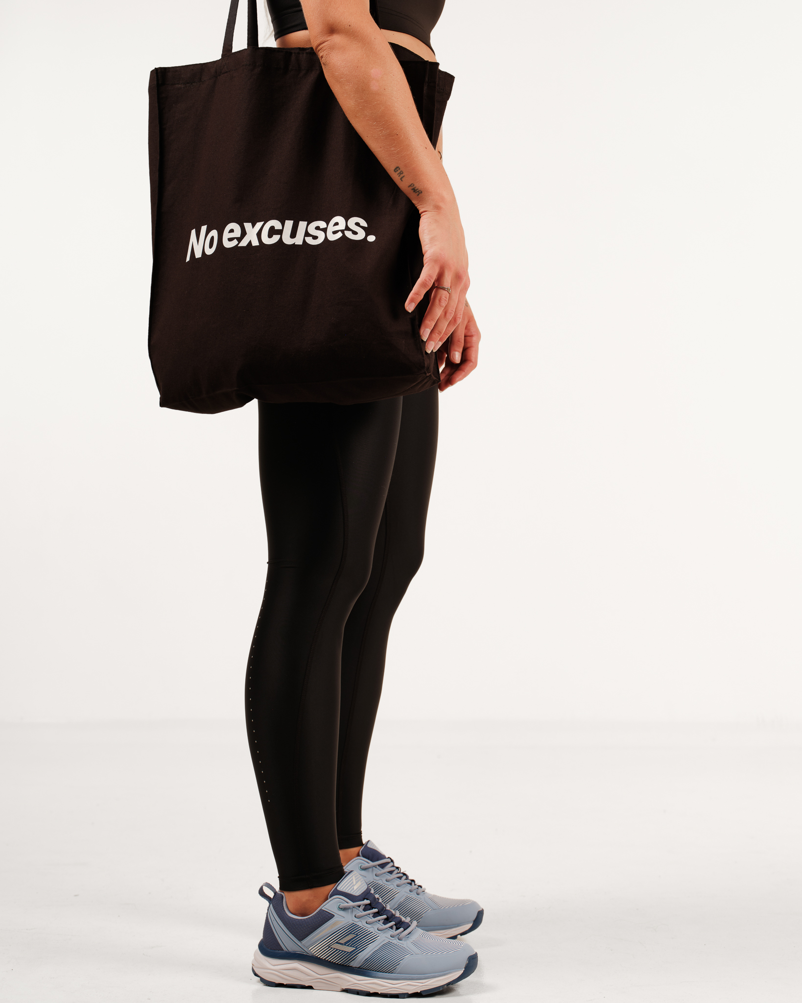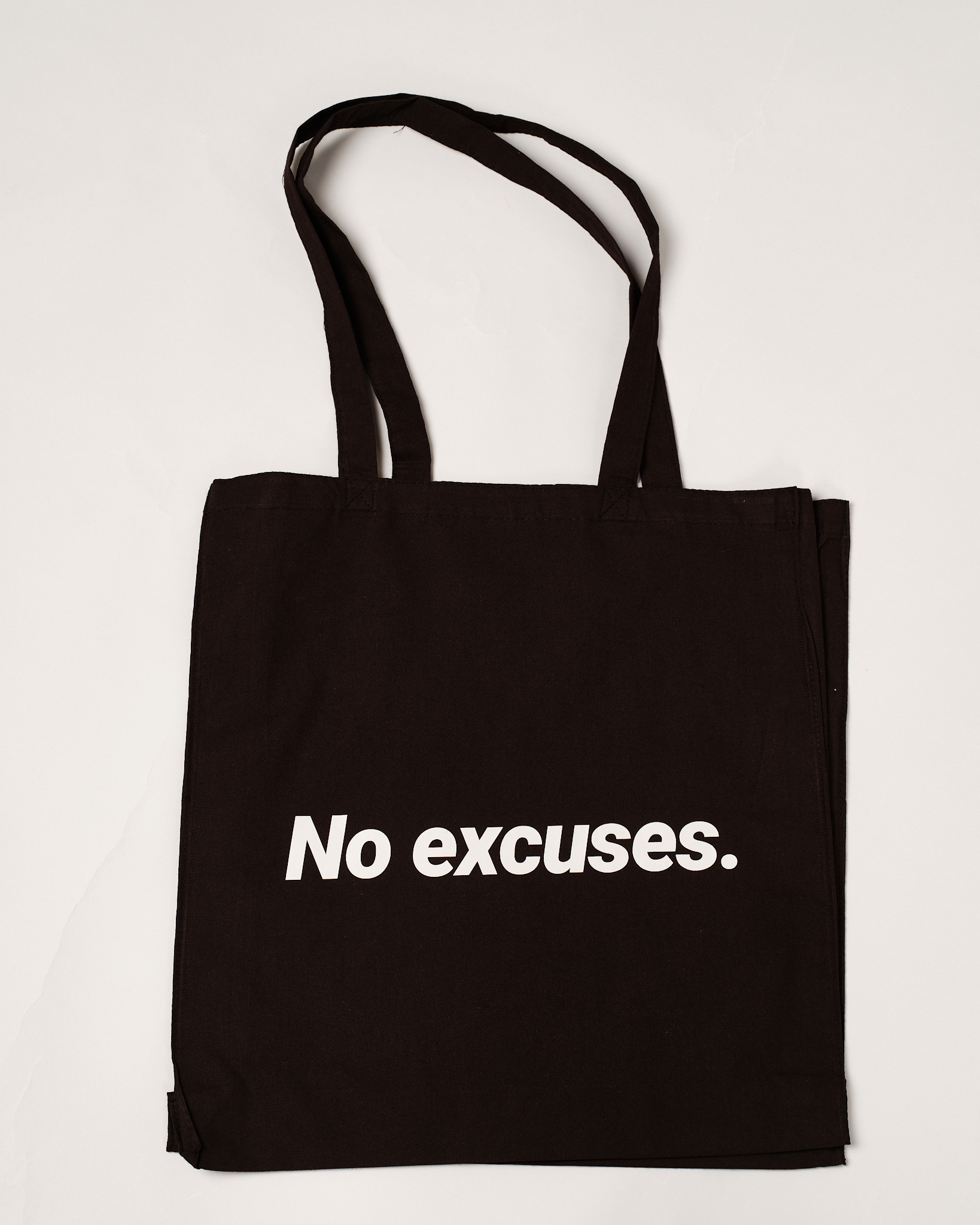 Vår signatur totebag med slagordet vårt "No excuses" som print.