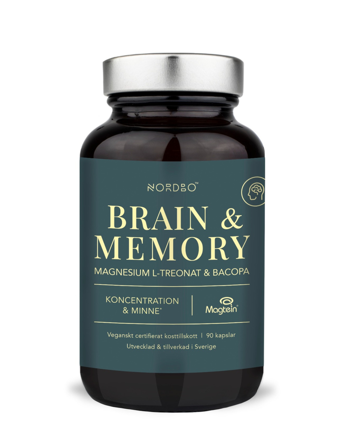 NORDBO Brain & Memory Magnesium er utviklet for å støtte hukommelse, konsentrasjon og normal psykologisk funksjon. Formuleringen kombinerer Magtein® (magnesium L-treonat), magnesiumbisglysinat og Ebel.One™ bacopaekstrakt – nøye utvalgte ingredienser med fokus på kognitiv ytelse.