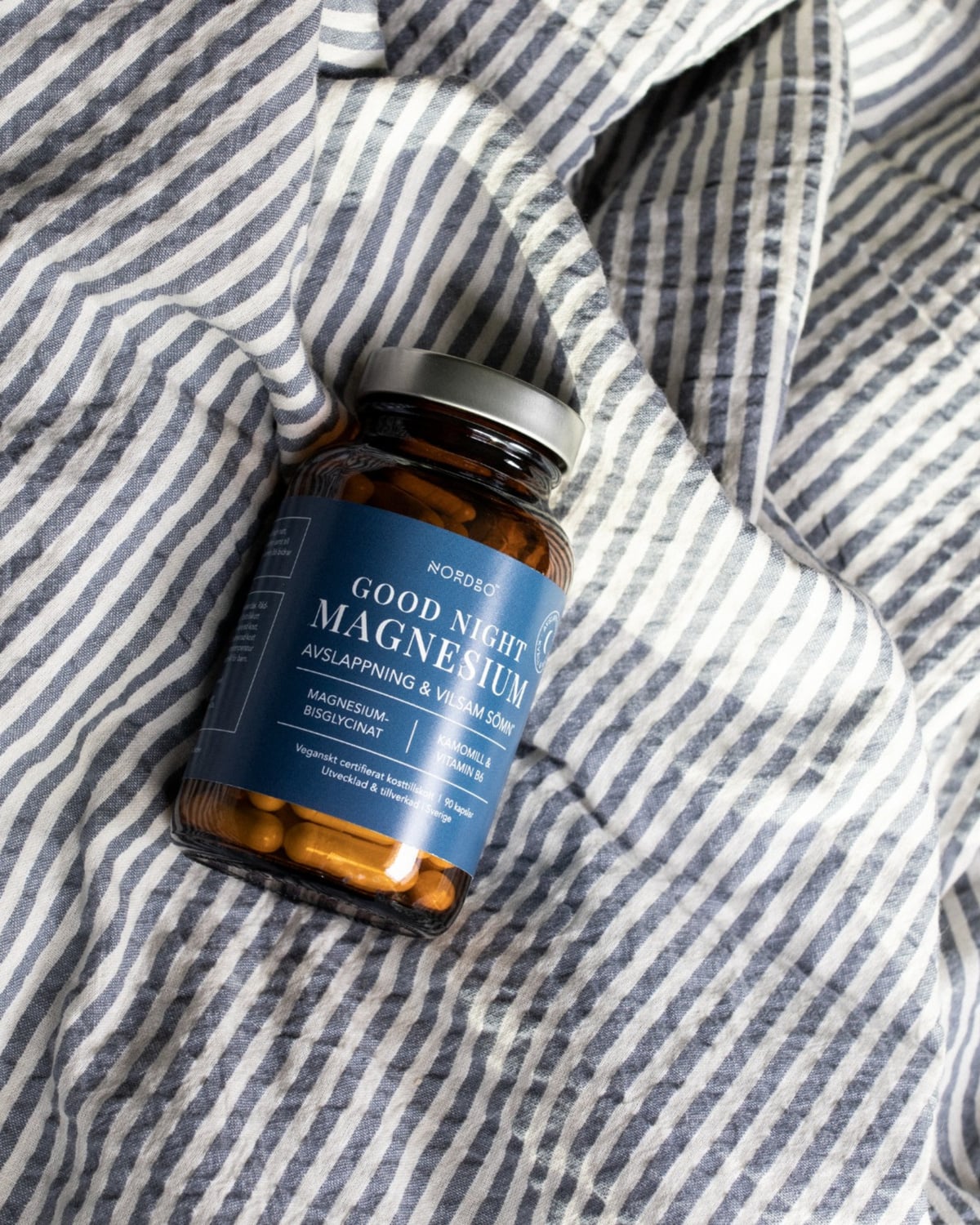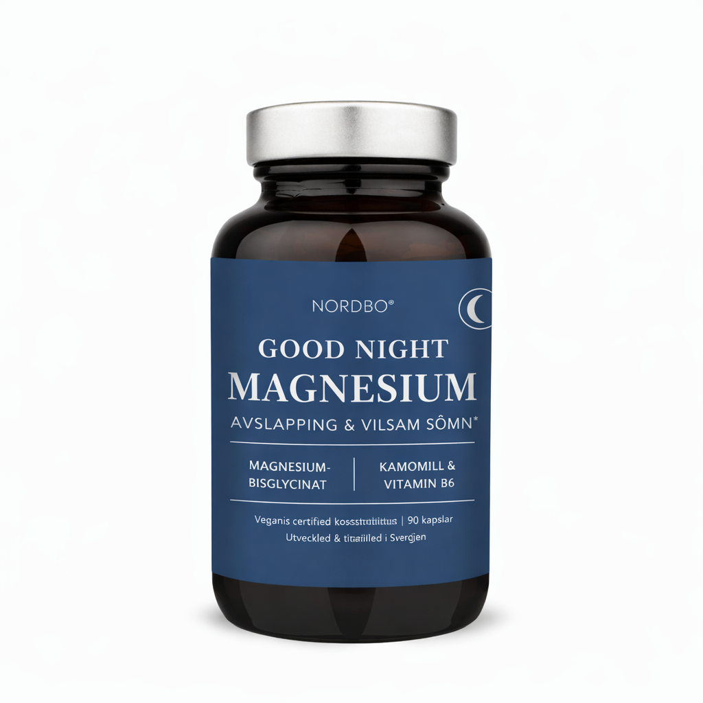 NORDBO Good Night Magnesium er et kosttilskudd utviklet spesielt for kveldsbruk. Formuleringen kombinerer magnesium i form av magnesiumbisglysinat med kamilleekstrakt og vitamin B6 – nøye utvalgte ingredienser for avslapning og normal funksjon i nervesystemet.