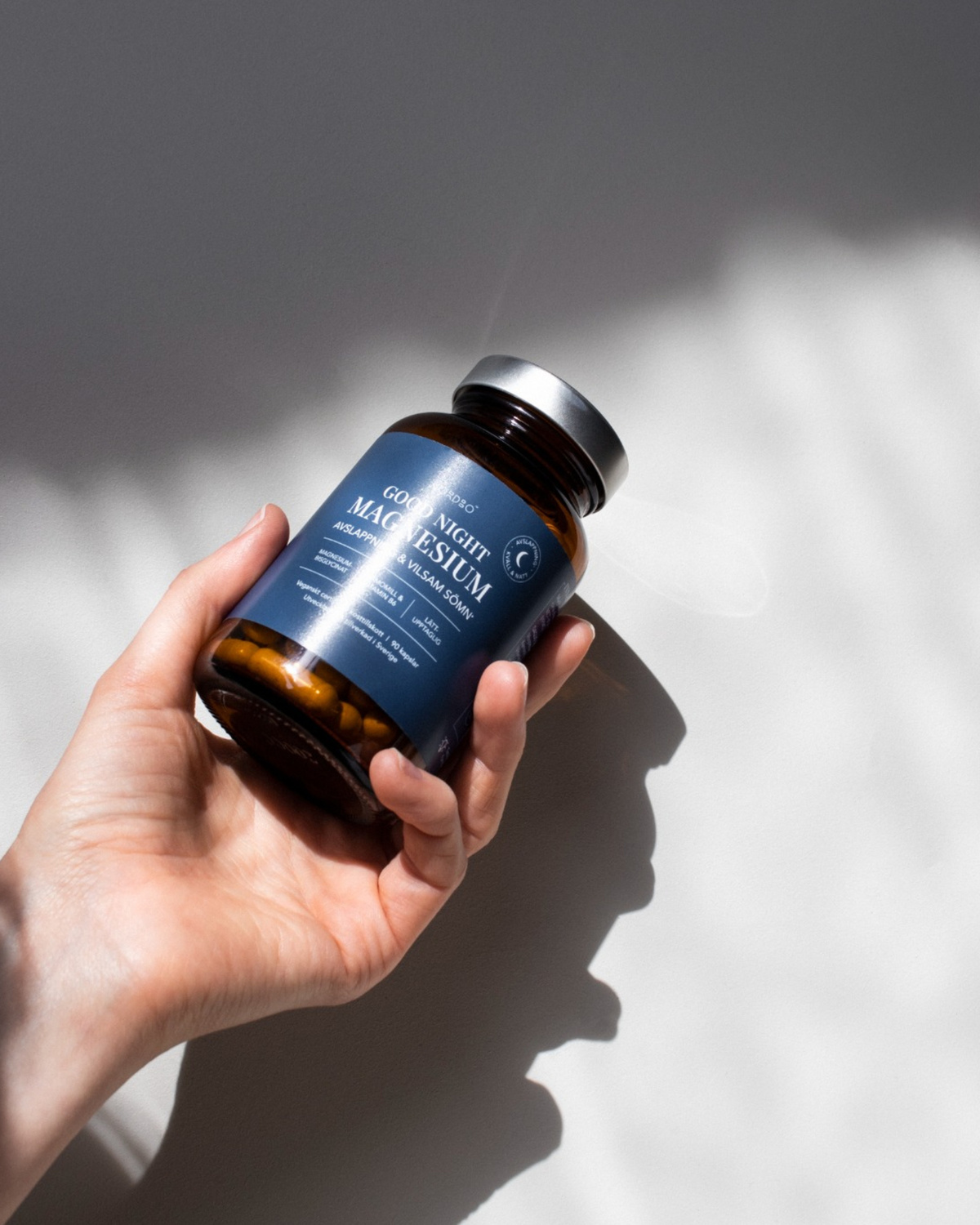 Good Night Magnesium inneholder magnesiumbisglysinat, en form der magnesium er bundet til aminosyren glysin. Dette gir høy biotilgjengelighet og gjør magnesium skånsomt for magen. Magnesium bidrar til nervesystemets normale funksjon samt til å redusere tretthet og utmattelse.
