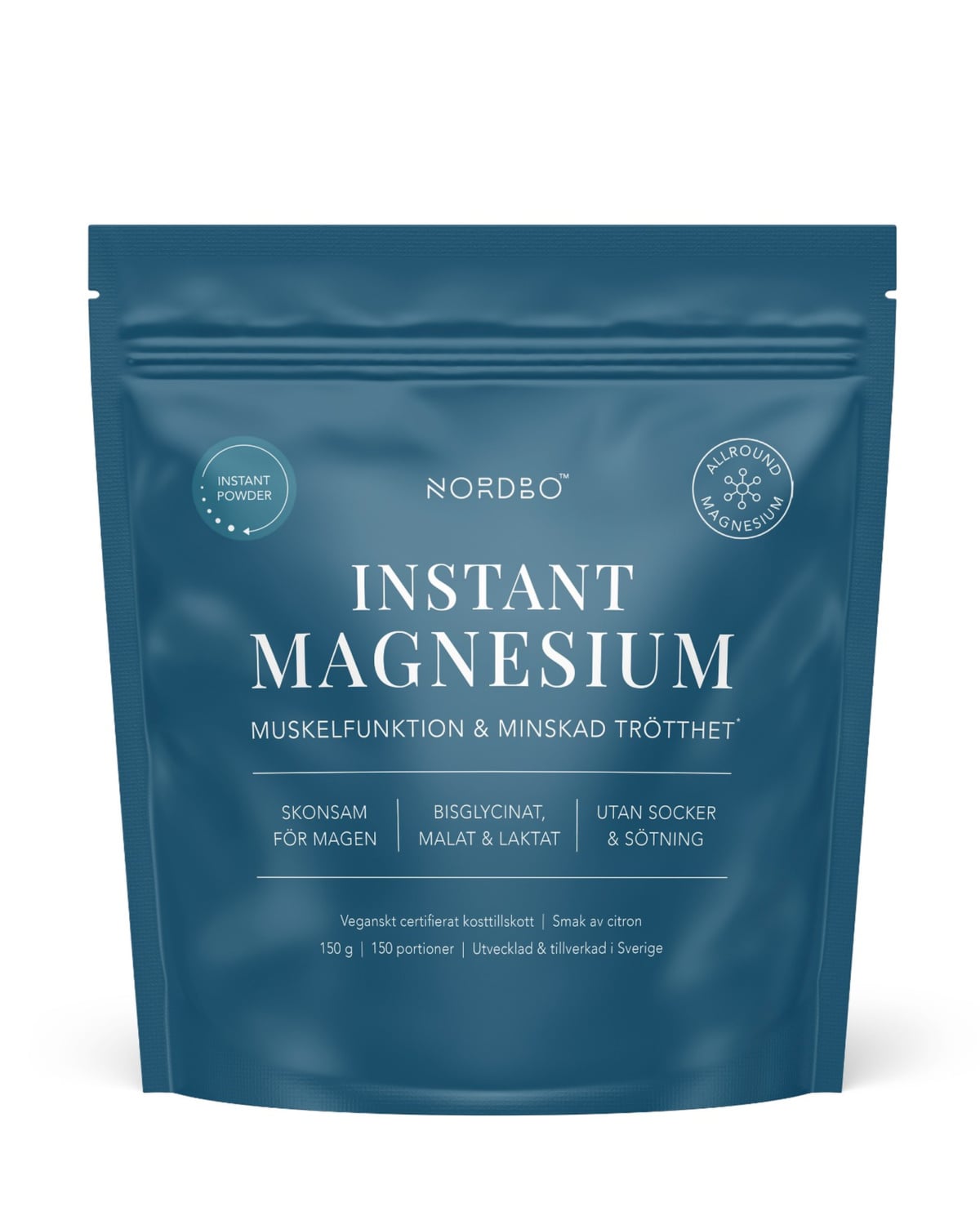 NORDBO Instant Magnesium er et allsidig magnesiumtilskudd i form av hurtigoppløselig pulver. Produktet kombinerer tre magnesiumformer med høy biotilgjengelighet: magnesiumbisglysinat, magnesiummalat og magnesiumlaktat. Pulveret løser seg lett i vann og har en frisk smak av sitron.