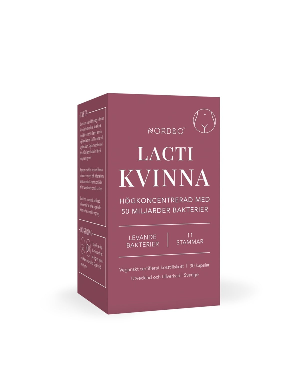 NORDBO LactiKvinna er et høydosert kosttilskudd med garantert 50 milliarder melkesyrebakterier per kapsel, fordelt på 11 nøye utvalgte stammer. Produktet er spesielt utviklet for kvinner og inneholder derfor 90 % Lactobacillus-bakterier, som naturlig dominerer kvinnens bakterieflora.